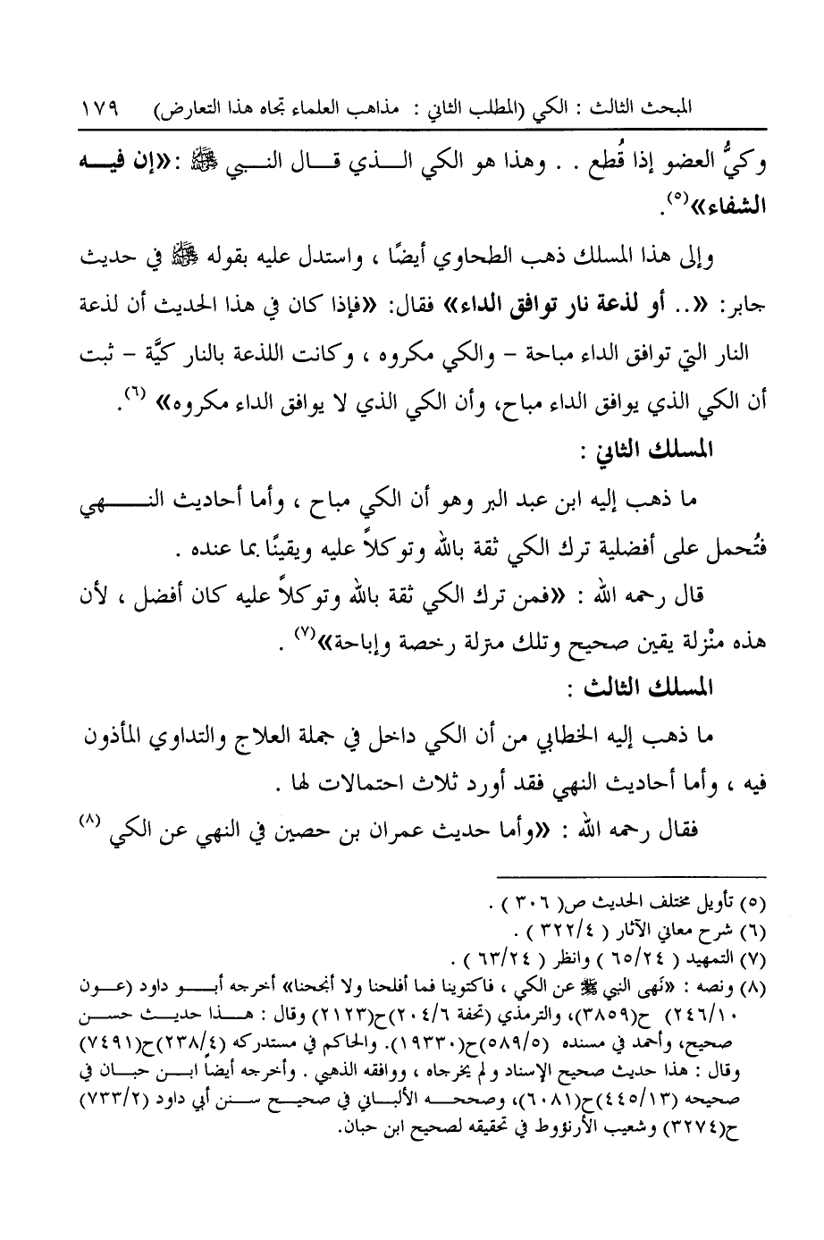وإلى هذا المسلك ذهب الطحاوي أيضًا، واستدل عليه بقوله -صَلَّى اللهُ عَلَيْهِ وَسَلَّمَ- في حديث جابر: " .. أو لذعة نار توافق الداء" فقال: "فإذا كان في هذا الحديث أن لذعة النار التي توافق الداء مباحة -والكى مكروه، وكانت اللذعة بالنار كيَّة- ثبت أن الكى الذي يوافق الداء مباح، وأن الكي الذي لا يوافق الداء مكروه" (¬٦).