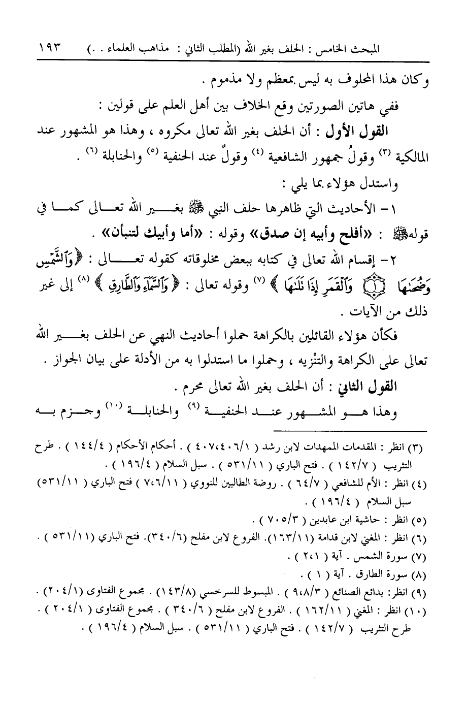 القول الأول: أن الحلف بغير الله تعالى مكروه، وهذا هو المشهور عند المالكية (¬٣) وقولُ جمهور الشافعية (¬٤) وقولٌ عند الحنفية (¬٥) والحنابلة (¬٦).