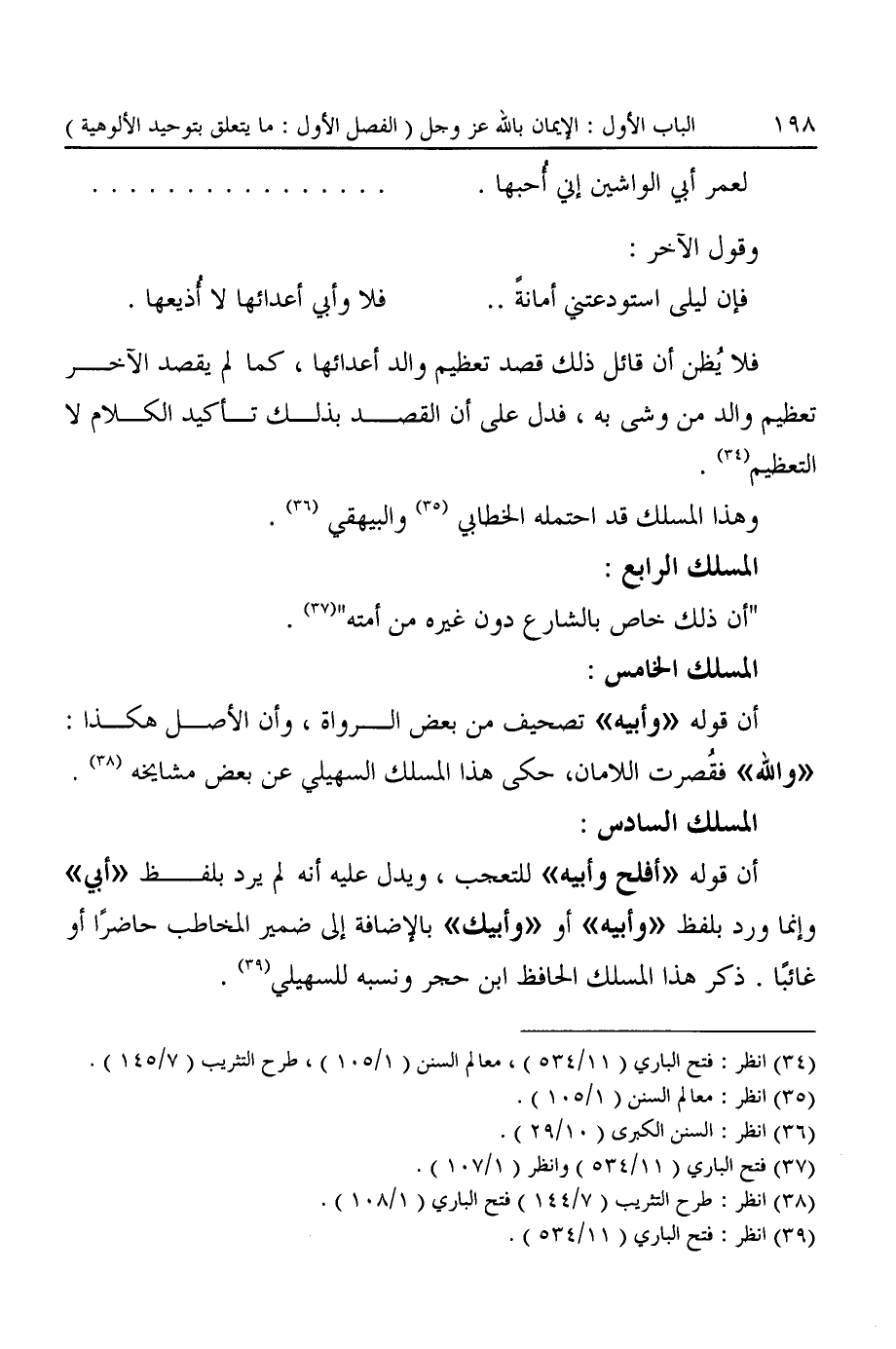 أن قوله "وأبيه" تصحيف من بعض الرواة، وأن الأصل هكذا: "والله" فقُصرت اللامان، حكى هذا المسلك السهيلى عن بعض مشايخه (¬٣٨).