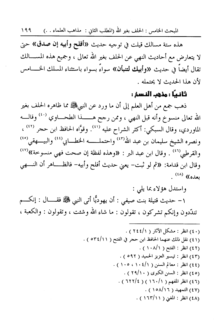 ذهب جمع من أهل العلم إلى أن ما ورد عن النبي -صَلَّى اللهُ عَلَيْهِ وَسَلَّمَ- مما ظاهره الحلف بغير الله تعالى منسوخ وأنه قبل النهى، وممن رجح هذا الطحاوي (¬٤٠) وقاله الماوردي، وقال السبكى: أكثر الشراح عليه (¬٤١). وقوَّاه الحافظ ابن حجر (¬٤٢)، ونصره الشيخ سليمان بن عبد الله (¬٤٣) واحتمله الخطابي (¬٤٤) والبيهقي (¬٤٥) والقرطبي (¬٤٦). وقال ابن عبد البر: "وهذه لفظة إن صحت فهى منسوخة" (¬٤٧) وقال ابن قدامة: "ثم لو ثبت -يعني حديث أفلح وأبيه- فالظاهر أن النهى بعده" (¬٤٨).