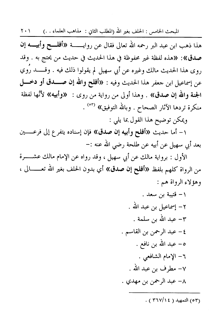 هذا ذهب ابن عبد البر رحمه الله تعالى فقال عن رواية "أفلح وأبيه إن صدق": "هذه لفظة غير محفوظة في هذا الحديث في حديث من يحتج به. وقد روى هذا الحديث مالك وغيره عن أبي سهيل لم يقولوا ذلك فيه. وقد رُوي عن إسماعيل ابن جعفر هذا الحديث وفيه: "أفلح والله إن صدق أو دخل الجنة والله إن صدق". وهذا أولى من رواية من روى: "وأبيه" لأنَّها لفظة منكرة تردها الآثار الصحاح. وبالله التوفيق" (¬٥٣).