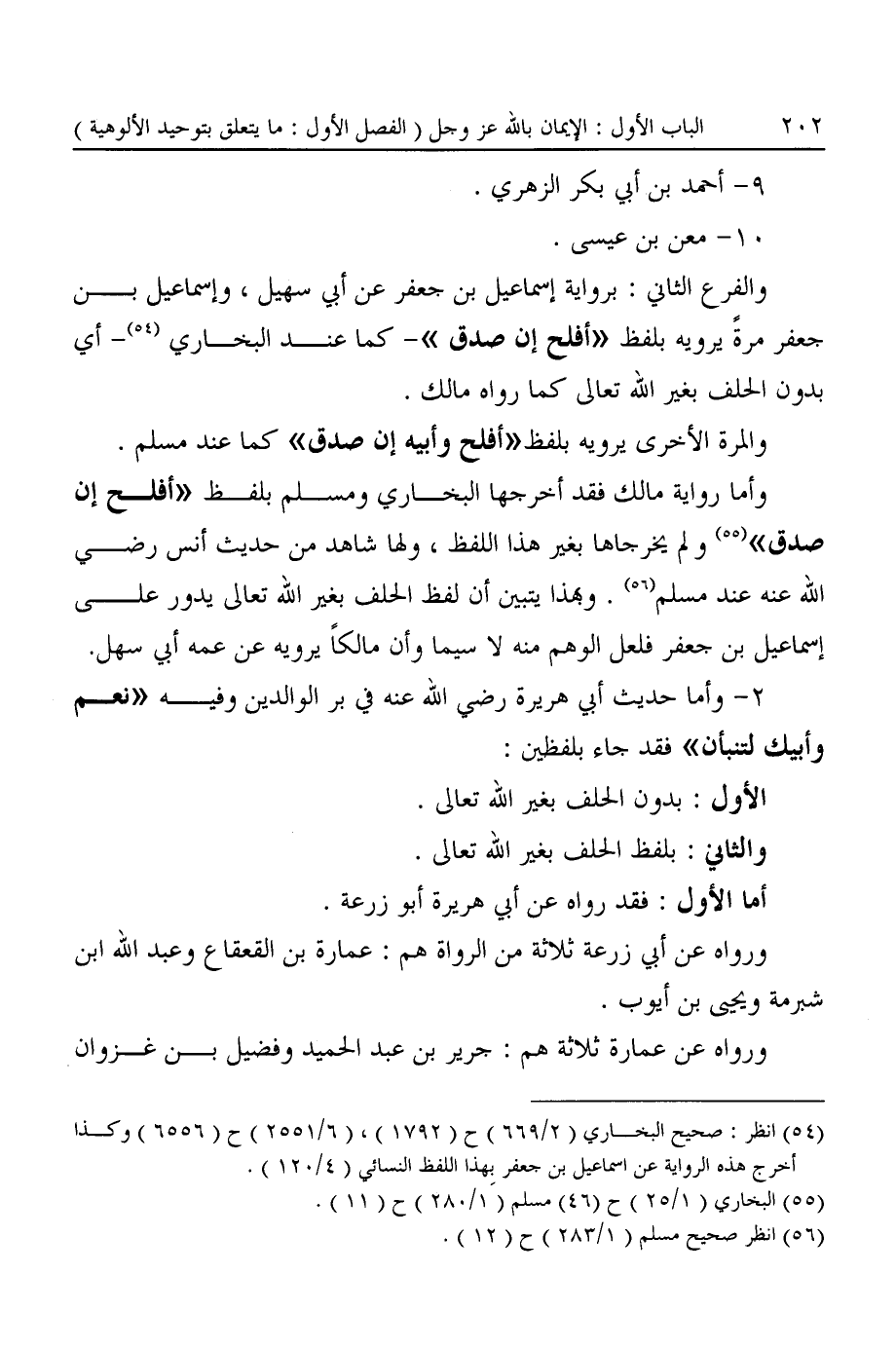 والفرع الثاني: برواية إسماعيل بن جعفر عن أبى سهيل، وإسماعيل بن جعفر مرةً يرويه بلفظ "أفلح إن صدق" -كما عند البخاري (¬٥٤) - أي بدون الحلف بغير الله تعالى كما رواه مالك.