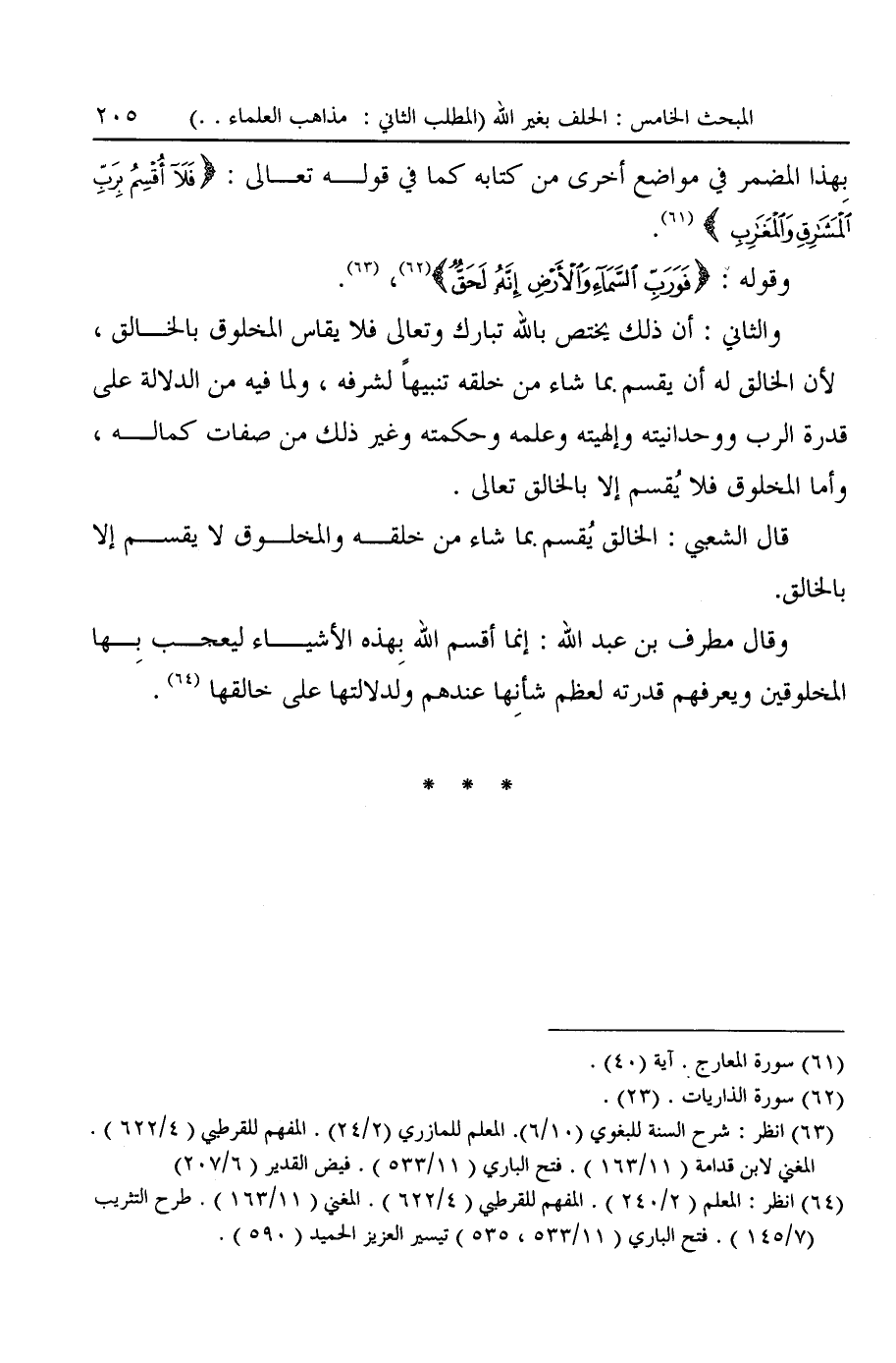 وقال مطرف بن عبد الله: إنما أقسم الله بِهذه الأشياء ليعجب بِها المخلوقين ويعرفهم قدرته لعظم شأنِها عندهم ولدلالتها على خالقها (¬٦٤).