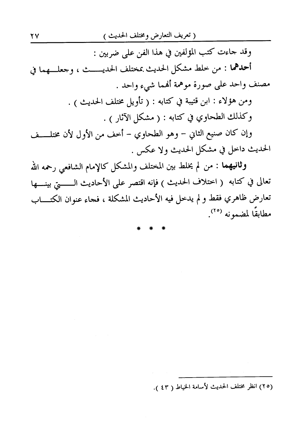وثانيهما: من لم يخلط بين المختلف والمشكل كالإمام الشافعى رحمه الله تعالى في كتابه (اختلاف الحديث) فإنه اقتصر على الأحاديث التي بينها تعارض ظاهري فقط ولم يدخل فيه الأحاديث المشكلة، فجاء عنوان الكتاب مطابقًا لمضمونه (¬٢٥).
