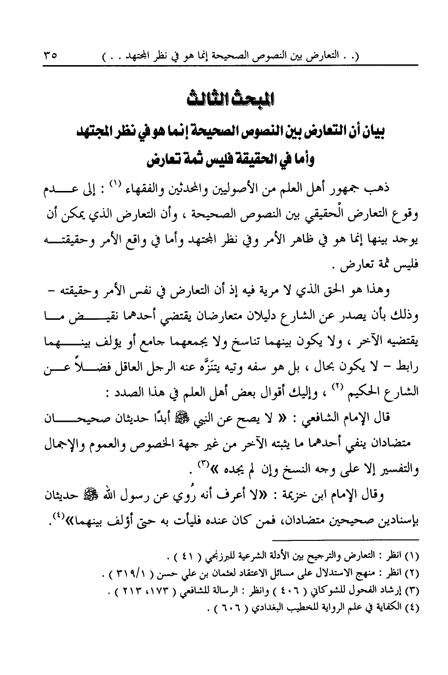 المبحث الثالث بيان أن التعارض بين النصوص الصحيحة إنما هو في نظر المجتهد وأما في الحقيقة فليس ثمة تعارض