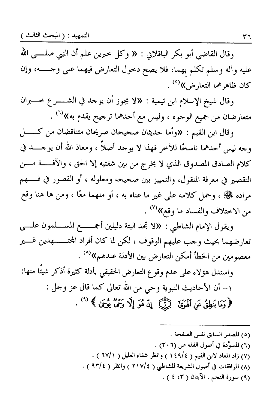 وقال شيخ الإسلام ابن تيمية: "لا يجوز أن يوجد في الشرع خبران متعارضان من جميع الوجوه، وليس مع أحدهما ترجيح يقدم به" (¬٦).