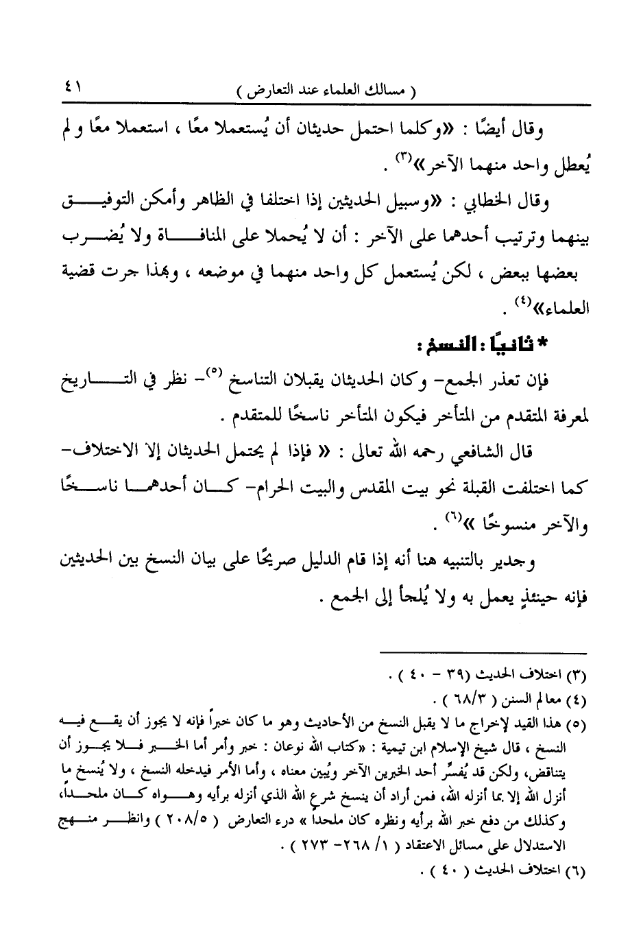 (¬٥) هذا القيد لإخراج ما لا يقبل النسخ من الأحاديث وهو ما كان خبرًا فإنه لا يجوز أن يقع فيه النسخ، قال شيخ الإسلام ابن تيمية: "كتاب الله نوعان: خبر وأمر أما الخبر فلا يجوز أن يتناقض، ولكن قد يُفسِّر أحد الخبرين الآخر ويُبين معناه، وأما الأمر فيدخله النسخ، ولا يُنسخ ما أنزل الله إلا بما أنزله الله، فمن أراد أن ينسخ شرع الله الذى أنزله برأيه وهواه كان ملحدًا، وكذلك من دفع خبر الله برأيه ونظره كان ملحدا" درء التعارض (٥/ ٢٠٨) وانظر منهج الاستدلال على مسائل الاعتقاد (١/ ٢٦٨ - ٢٧٣).