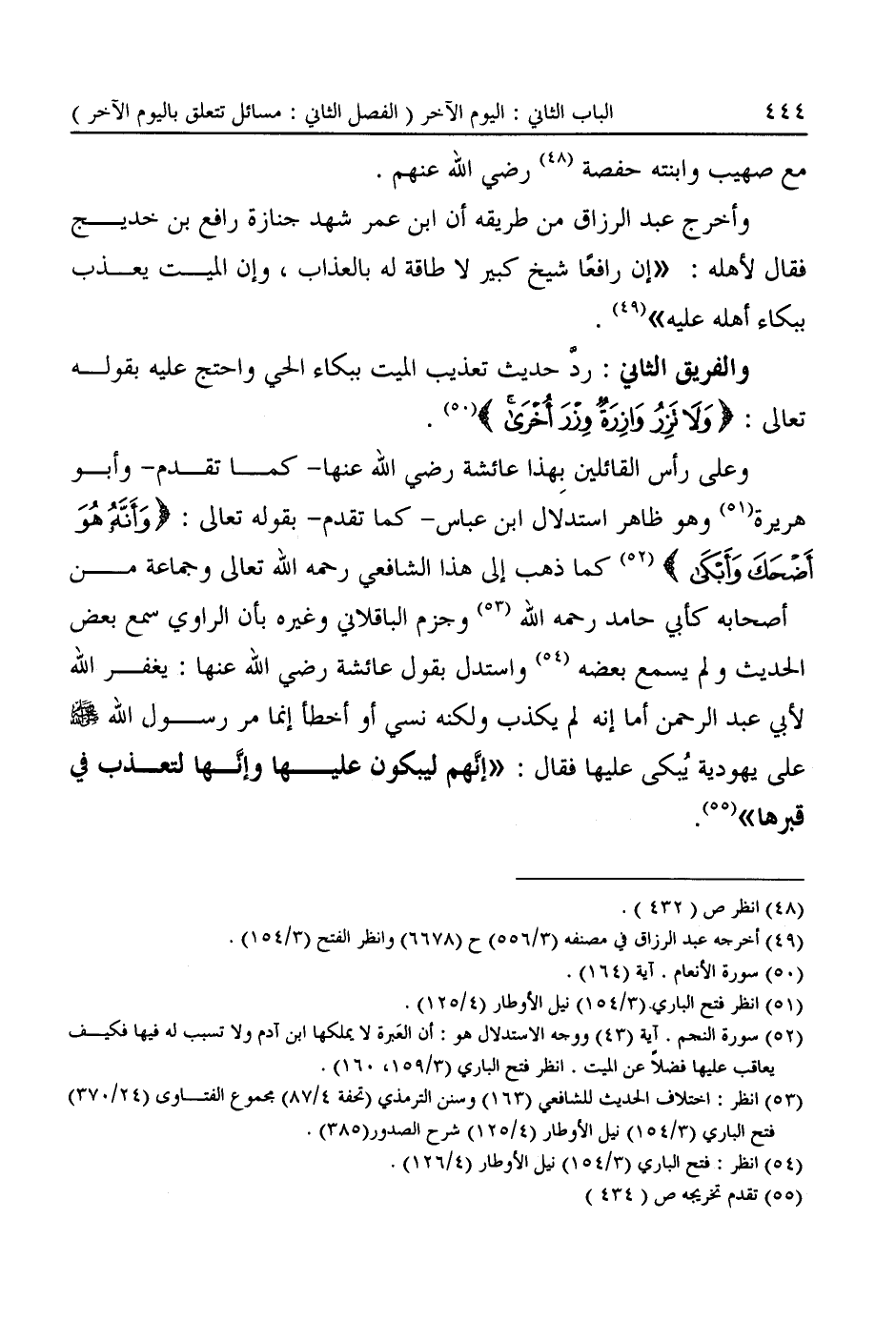 (¬٥٢) سورة النجم. آية (٤٣) ووجه الاستدلال هو: أن العَبرة لا يملكها ابن آدم ولا تسبب له فيها فكيف يعاقب عليها فضلًا عن الميت. انظر فتح الباري (٣/ ١٥٩، ١٦٠).
