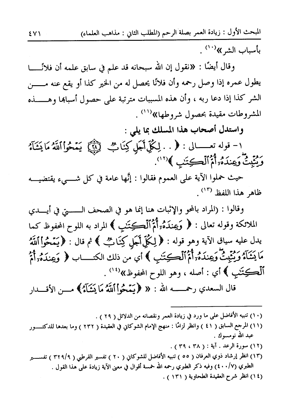١ - قوله تعالى: { .. لِكُلِّ أَجَلٍ كِتَابٌ (٣٨) يَمْحُو اللَّهُ مَا يَشَاءُ وَيُثْبِتُ وَعِنْدَهُ أُمُّ الْكِتَابِ} (¬١٢).