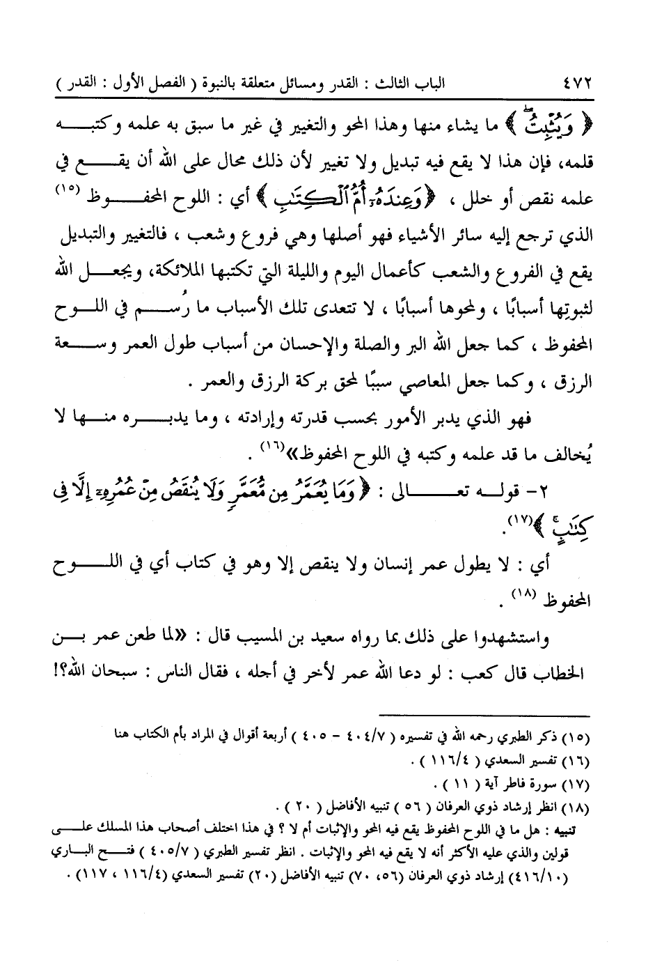 تنبيه: هل ما في اللوح المحفوظ يقع فيه المحو والإثبات أم لا؟ في هذا اختلف أصحاب هذا المسلك على قولين والذى عليه الأكثر أنه لا يقع فيه المحو والإثبات. انظر تفسير الطبري (٧/ ٤٠٥) فتح البارى (١٠/ ٤١٦) إرشاد ذوى العرفان (٥٦، ٧٠) تنبيه الأفاضل (٢٠) تفسير السعدي (٤/ ١١٦، ١١٧).