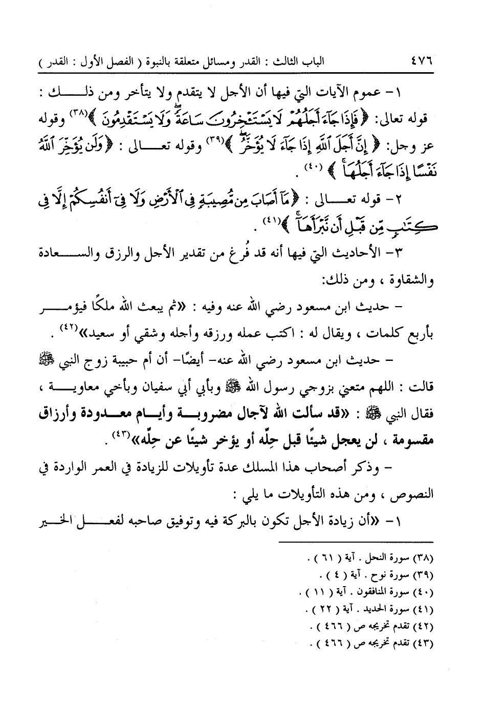 ١ - عموم الآيات التي فيها أن الأجل لا يتقدم ولا يتأخر ومن ذلك: قوله تعالى: {فَإِذَا جَاءَ أَجَلُهُمْ لَا يَسْتَأْخِرُونَ سَاعَةً وَلَا يَسْتَقْدِمُونَ} (¬٣٨) وقوله عز وجل: {إِنَّ أَجَلَ اللَّهِ إِذَا جَاءَ لَا يُؤَخَّرُ} (¬٣٩) وقوله تعالى: {وَلَنْ يُؤَخِّرَ اللَّهُ نَفْسًا إِذَا جَاءَ أَجَلُهَا} (¬٤٠).