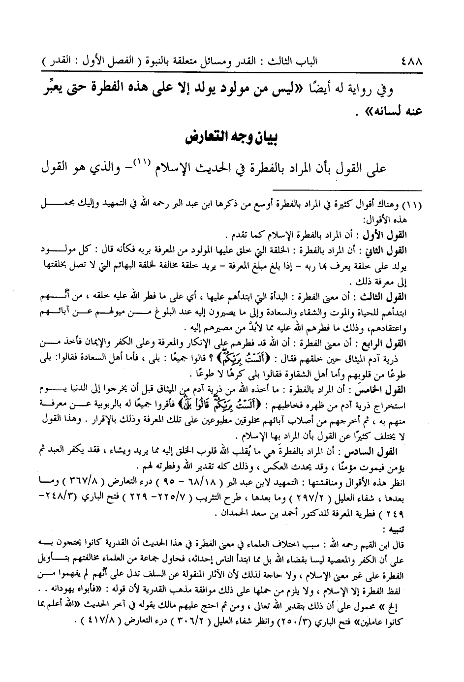 انظر هذه الأقوال ومناقشتها: التمهيد لابن عبد البر (١٨/ ٦٨ - ٩٥) درء التعارض (٨/ ٣٦٧) وما بعدها، شفاء العليل (٢/ ٢٩٧) وما بعدها، طرح التثريب (٧/ ٢٢٥ - ٢٢٩) فتح البارى (٣/ ٢٤٨ - ٢٤٩) فطرية المعرفة للدكتور أحمد بن سعد الحمدان.