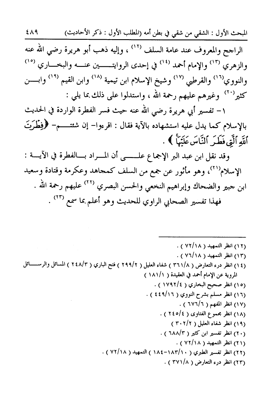 ١ - تفسير أبي هريرة رضى الله عنه حيث فسر الفطرة الواردة في الحديث بالإسلام كما يدل عليه استشهاده بالآية فقال: اقرءوا -إن شئتم- {فِطْرَتَ اللَّهِ الَّتِي فَطَرَ النَّاسَ عَلَيْهَا}.