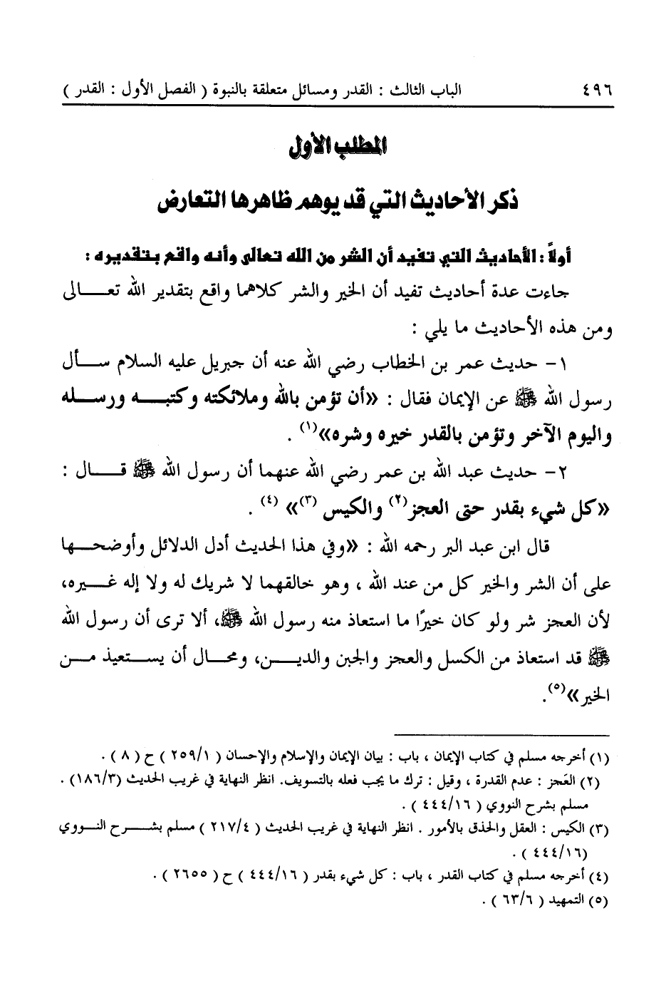 أولًا: الأحاديث التي تفيد أن الشر من الله تعالى وأنه واقع بتقديره: