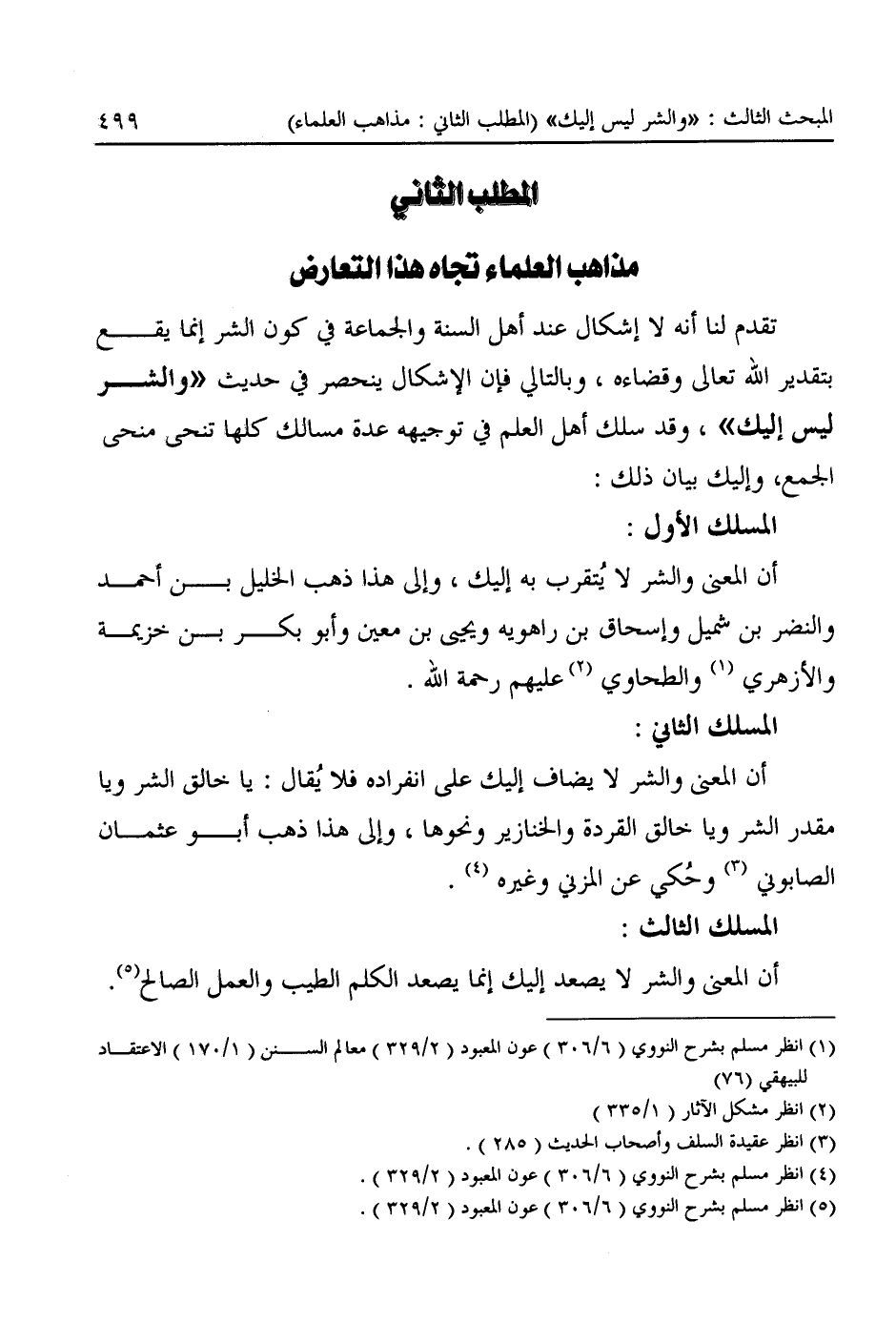 تقدم لنا أنه لا إشكال عند أهل السنة والجماعة في كون الشر إنما يقع بتقدير الله تعالى وقضاءه، وبالتالي فإن الإشكال ينحصر في حديث "والشر ليس إليك"، وقد سلك أهل العلم في توجيهه عدة مسالك كلها تنحى منحى الجمع، وإليك بيان ذلك: