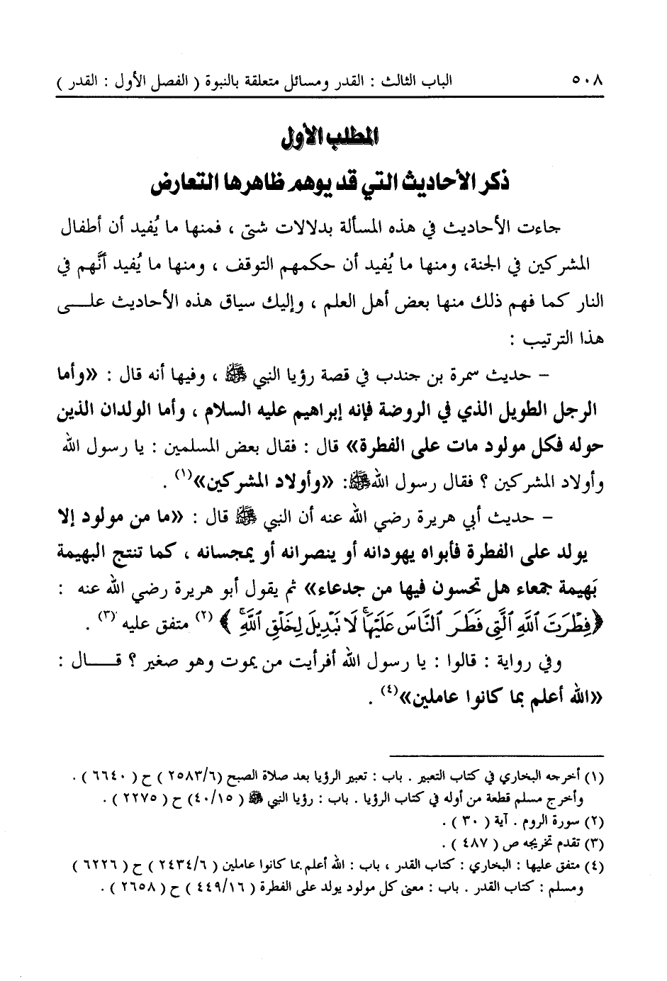 - حديث سمرة بن جندب في قصة رؤيا النبى -صَلَّى اللهُ عَلَيْهِ وَسَلَّمَ-، وفيها أنه قال: "وأما الرجل الطويل الذي في الروضة فإنه إبراهيم عليه السلام، وأما الولدان الذين حوله فكل مولود مات على الفطرة" قال: فقال بعض المسلمين: يا رسول الله وأولاد المشركين؟ فقال رسول الله -صَلَّى اللهُ عَلَيْهِ وَسَلَّمَ-: "وأولاد المشركين" (¬١).