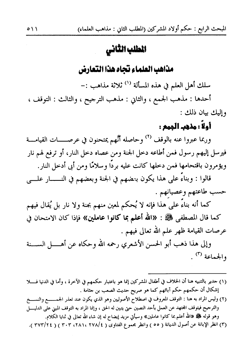 (¬٢) وليس المراد به هنا: التوقف المعروف في اصطلاح الأصوليين وهو الذى يكون عند تعذر الجمع والنسخ والترجيح فيتوقف المجتهد عن العمل بأحد النصين حتى يتبين له الحق، وإنما المراد به التوقف المبني على الدليل وهو قوله -صَلَّى اللهُ عَلَيْهِ وَسَلَّمَ- "الله أعلم بما كانوا عاملين" وسيأتي مزيد إيضاح له إن شاء الله تعالى في ثنايا الكلام.