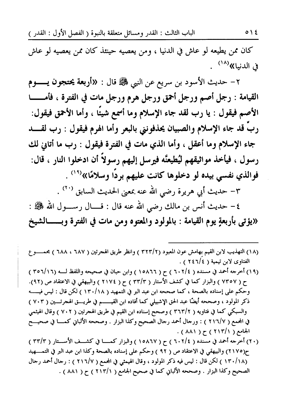 ٢ - حديث الأسود بن سريع عن النبى -صَلَّى اللهُ عَلَيْهِ وَسَلَّمَ- قال: "أربعة يحتجون يوم القيامة: رجل أصم ورجل أحمق ورجل هرم ورجل مات في الفترة، فأما الأصم فيقول: يا رب لقد جاء الإسلام وما أسمع شيئًا، وأما الأحمق فيقول: ربّ قد جاء الإسلام والصبيان يحذفونني بالبعر وأما الهرم فيقول: رب لقد جاء الإسلام وما أعقل، وأما الذي مات في الفترة فيقول: رب ما أتاني لك رسول، فيأخذ مواثيقهم ليُطيعنَّه فيرسل إليهم رسولًا أن ادخلوا النار، قال: فوالذي نفسي بيده لو دخلوها كانت عليهم بردًا وسلامًا" (¬١٩).