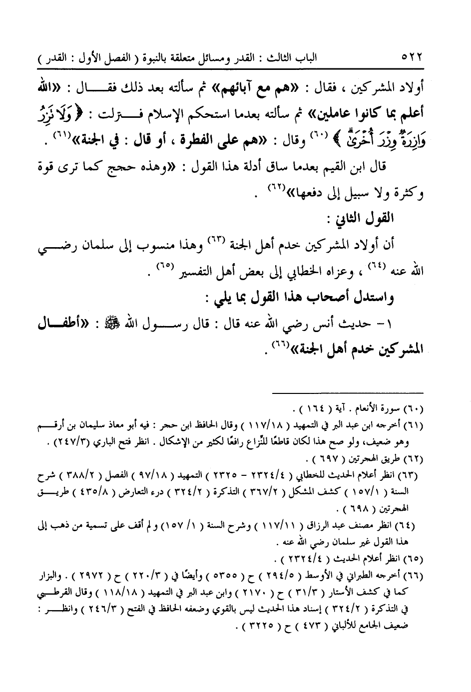 أن أولاد المشركين خدم أهل الجنة (¬٦٣) وهذا منسوب إلى سلمان رضي الله عنه (¬٦٤)، وعزاه الخطابي إلى بعض أهل التفسير (¬٦٥).