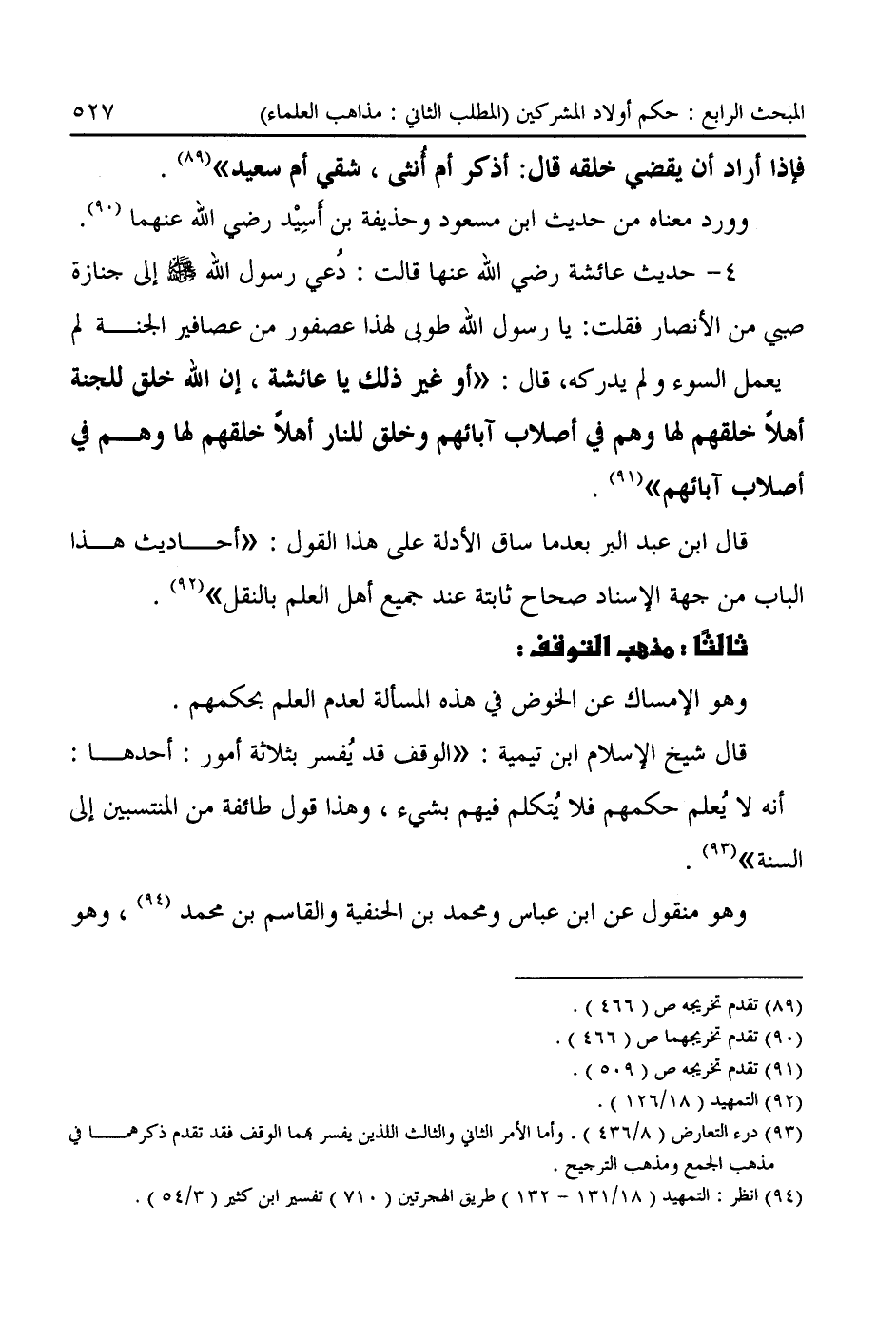 قال شيخ الإسلام ابن تيمية: "الوقف قد يُفسر بثلاثة أمور: أحدها: أنه لا يُعلم حكمهم فلا يُتكلم فيهم بشىء، وهذا قول طائفة من المنتسبين إلى السنة" (¬٩٣).