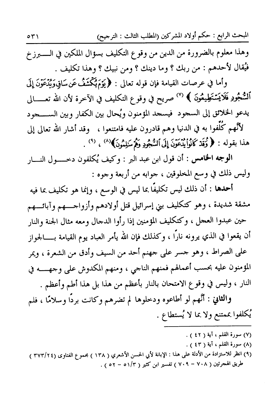 وأما في عرصات القيامة فإن قوله تعالى: {يَوْمَ يُكْشَفُ عَنْ سَاقٍ وَيُدْعَوْنَ إِلَى السُّجُودِ فَلَا يَسْتَطِيعُونَ} (¬٧) صريح في وقوع التكليف في الآخرة لأن الله تعالى يدعو الخلائق إلى السجود فيسجد المؤمنون ويُحال بين الكفار وبين السجود لأَئهم كُلِّفوا به في الدنيا وهم قادرون عليه فامتنعوا، وقد أشار الله تعالى إلى هذا بقوله: {وَقَدْ كَانُوا يُدْعَوْنَ إِلَى السُّجُودِ وَهُمْ سَالِمُونَ} (¬٨)، (¬٩).