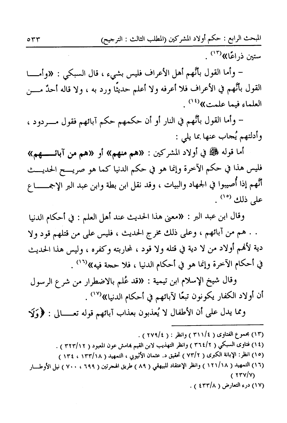 أما قوله -صَلَّى اللهُ عَلَيْهِ وَسَلَّمَ- في أولاد المشركين: "هم منهم" أو "هم من آبائهم" فليس هذا في حكم الآخرة وإنما هو في حكم الدنيا كما هو صريح الحديث أنَّهم إذا أُصيبوا في الجهاد والبيات، وقد نقل ابن بطة وابن عبد البر الإجماع على ذلك (¬١٥).