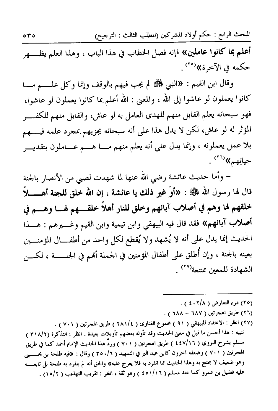 وقال ابن القيم: "النبى -صَلَّى اللهُ عَلَيْهِ وَسَلَّمَ- لم يجب فيهم بالوقف وإنما وكل علم ما كانوا يعملون لو عاشوا إلى الله، والمعنى: الله أعلم بما كانوا يعملون لو عاشوا، فهو سبحانه يعلم القابل منهم للهدى العامل به لو عاش، والقابل منهم للكفر المؤثر له لو عاش، لكن لا يدل هذا على أنه سبحانه يجزيهم بمجرد علمه فيهم بلا عمل يعملونه، وإنما يدل على أنه يعلم منهم ما هم عاملون بتقدير حياتِهم" (¬٢٦).