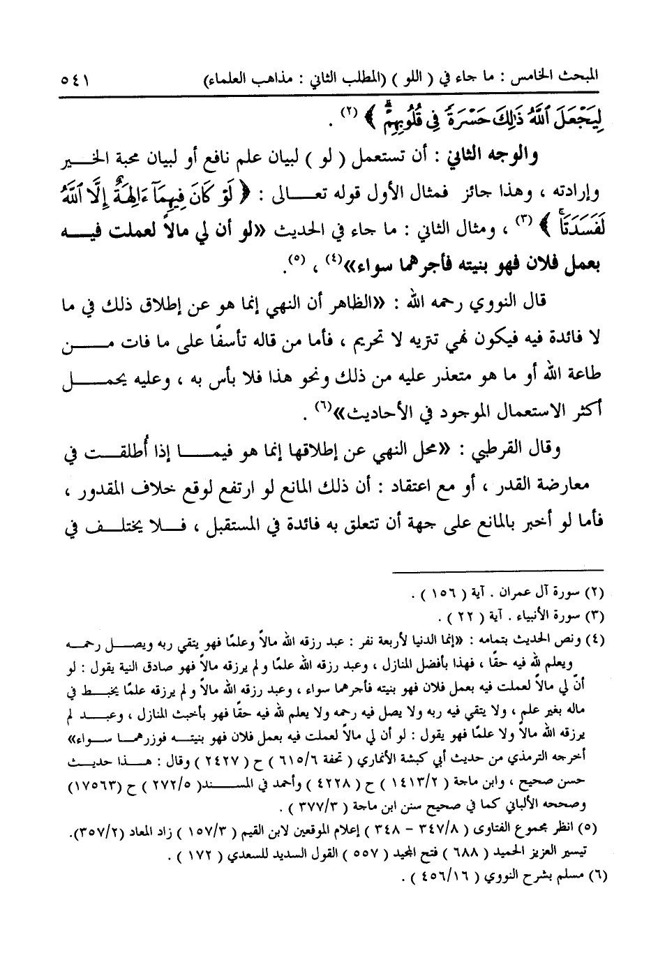 والوجه الثاني: أن تستعمل (لو) لبيان علم نافع أو لبيان محبة الخير وإرادته، وهذا جائز فمثال الأول قوله تعالى: {لَوْ كَانَ فِيهِمَا آلِهَةٌ إِلَّا اللَّهُ لَفَسَدَتَا} (¬٣)، ومثال الثاني: ما جاء في الحديث "لو أن لى مالًا لعملت فيه بعمل فلان فهو بنيته فأجرهما سواء" (¬٤)، (¬٥).