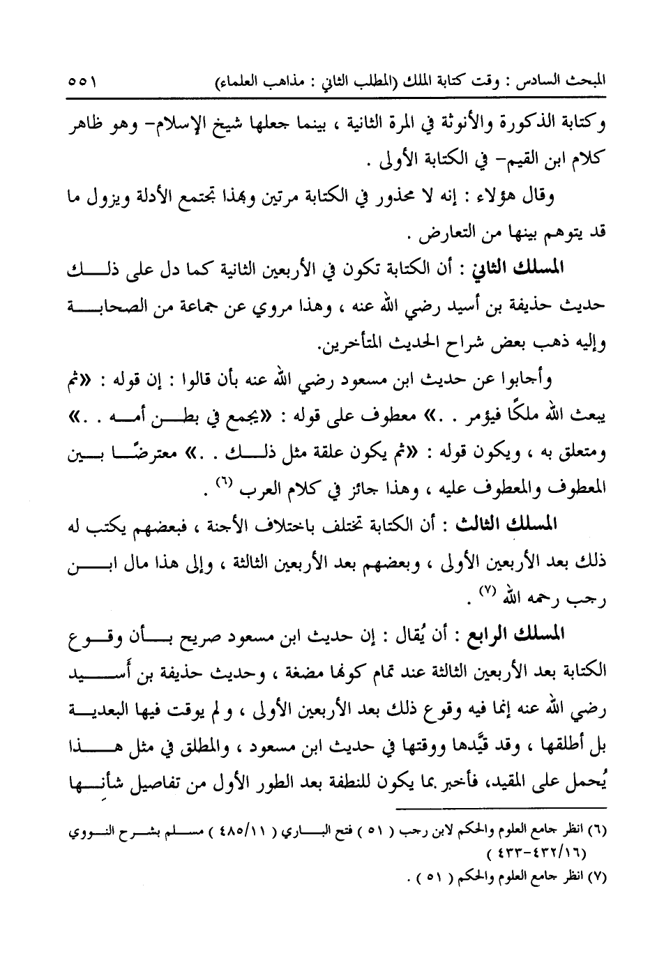 المسلك الثاني: أن الكتابة تكون في الأربعين الثانية كما دل على ذلك حديث حذيفة بن أسيد رضى الله عنه، وهذا مروي عن جماعة من الصحابة وإليه ذهب بعض شراح الحديث المتأخرين.