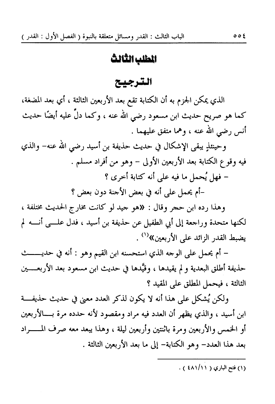 ولكن يُشكل على هذا أنه لا يكون لذكر العدد معنى في حديث حذيفة ابن أسيد، والذي يظهر أن العدد فيه مراد ومقصود لأنه حدده مرة بالأربعين أو الخمس والأربعين ومرة باثنتين وأربعين ليلة، وهذا يبعد معه صرف المراد بعد هذا العدد -وهو الكتابة- إلى ما بعد الأربعين الثالثة.