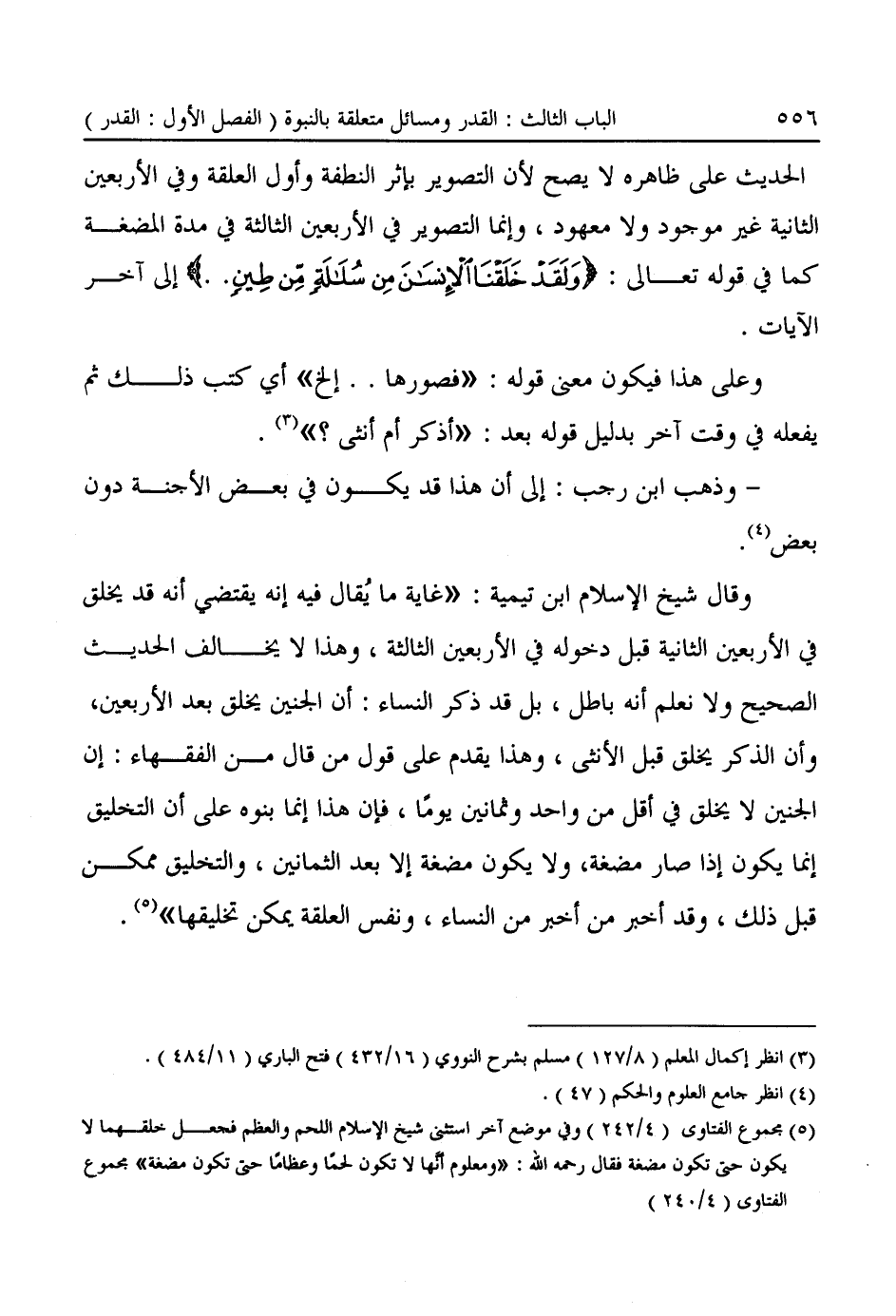وقال شيخ الإسلام ابن تيمية: "غاية ما يُقال فيه إنه يقتضي أنه قد يخلق في الأربعين الثانية قبل دخوله في الأربعين الثالثة، وهذا لا يخالف الحديث الصحيح ولا نعلم أنه باطل، بل قد ذكر النساء: أن الجنين يخلق بعد الأربعين، وأن الذكر يخلق قبل الأنثى، وهذا يقدم على قول من قال من الفقهاء: إن الجنين لا يخلق في أقل من واحد وثمانين يومًا، فإن هذا إنما بنوه على أن التخليق إنما يكون إذا صار مضغة، ولا يكون مضغة إلا بعد الثمانين، والتخليق ممكن قبل ذلك، وقد أخبر من أخبر من النساء، ونفس العلقة يمكن تخليقها" (¬٥).