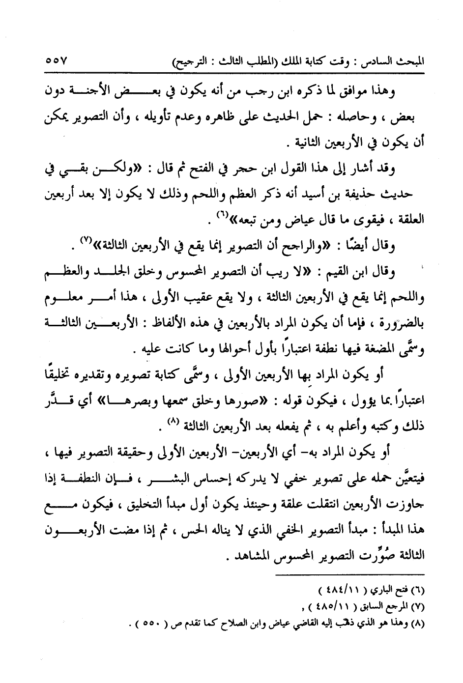 وقال ابن القيم: "لا ريب أن التصوير المحسوس وخلق الجلد والعظم واللحم إنما يقع في الأربعين الثالثة، ولا يقع عقيب الأولى، هذا أمر معلوم بالضرورة، فإما أن يكون المراد بالأربعين في هذه الألفاظ: الأربعين الثالثة وسمَّى المضغة فيها نطفة اعتبارًا بأول أحوالها وما كانت عليه.