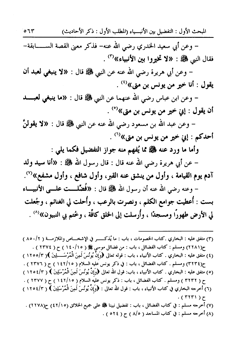 (¬٥) متفق عليه: البخاري. كتاب الأنبياء، باب: قول الله تعالى {وَإِنَّ يُونُسَ لَمِنَ الْمُرْسَلِينَ} (٣/ ١٢٥٤) ح (٣٢٣٢) ومسلم. كتاب الفضائل، باب: ذكر يونس عليه السلام (١٥/ ١٤٢) ح (٢٣٧٧).