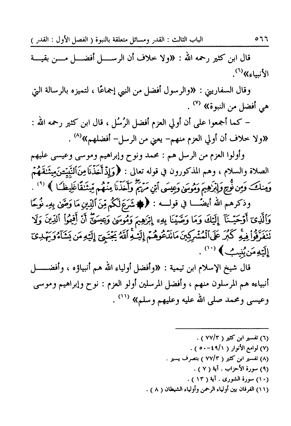قال شيخ الإسلام ابن تيمية: "وأفضل أولياء الله هم أنبياؤه، وأفضل أنبياءه هم المرسلون منهم، وأفضل المرسلين أولو العزم: نوح وإبراهيم وموسى وعيسى ومحمد صلى الله عليه وعليهم وسلم" (¬١١).