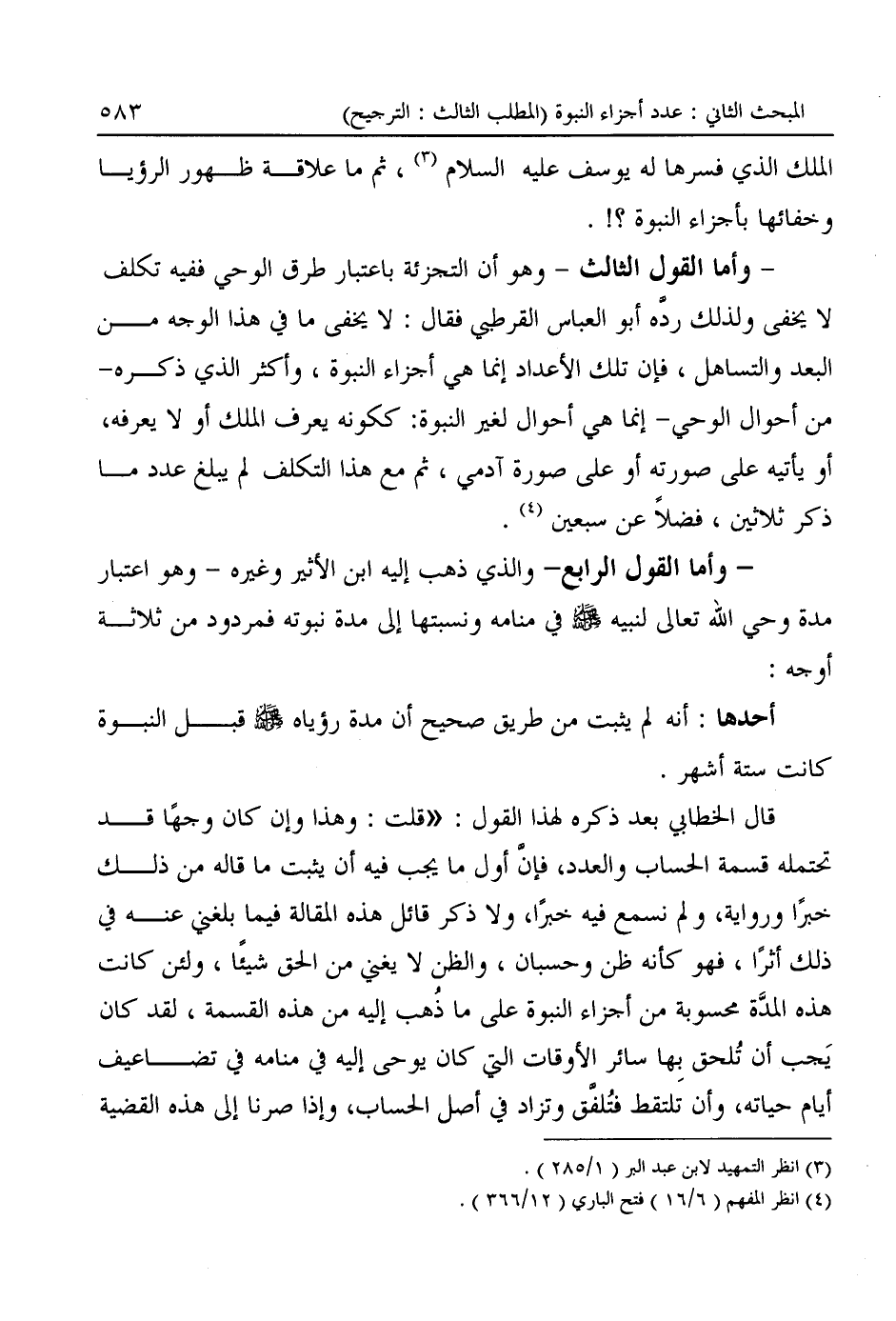 - وأما القول الرابع -والذي ذهب إليه ابن الأثير وغيره- وهو اعتبار مدة وحي الله تعالى لنبيه -صَلَّى اللهُ عَلَيْهِ وَسَلَّمَ- في منامه ونسبتها إلى مدة نبوته فمردود من ثلاثة أوجه: