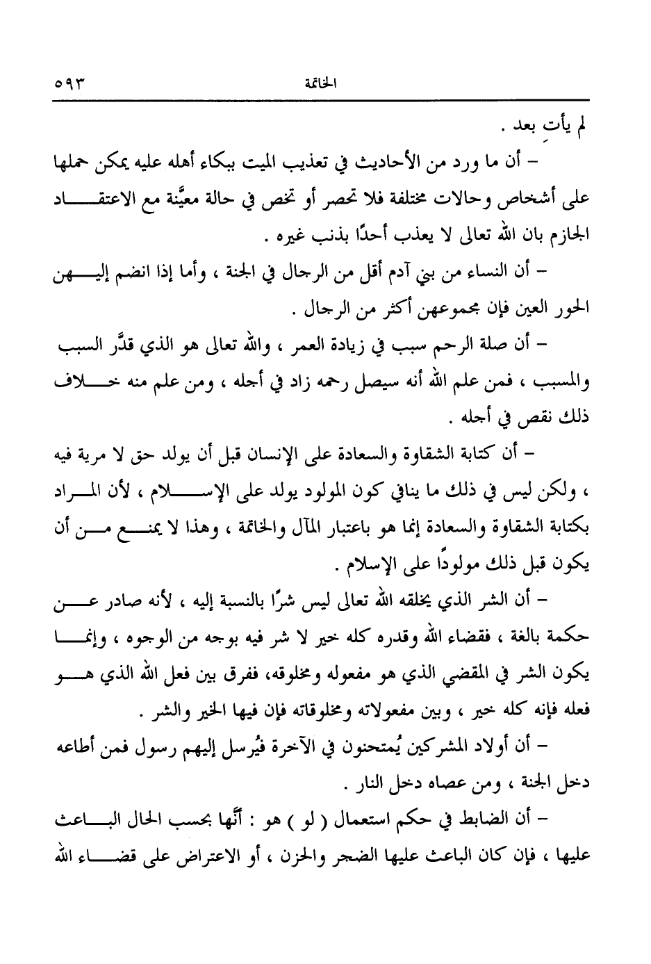 - أن كتابة الشقاوة والسعادة على الإنسان قبل أن يولد حق لا مرية فيه، ولكن ليس في ذلك ما ينافي كون المولود يولد على الإسلام، لأن المراد بكتابة الشقاوة والسعادة إنما هو باعتبار المآل والخاتمة، وهذا لا يمنع من أن يكون قبل ذلك مولودًا على الإسلام.