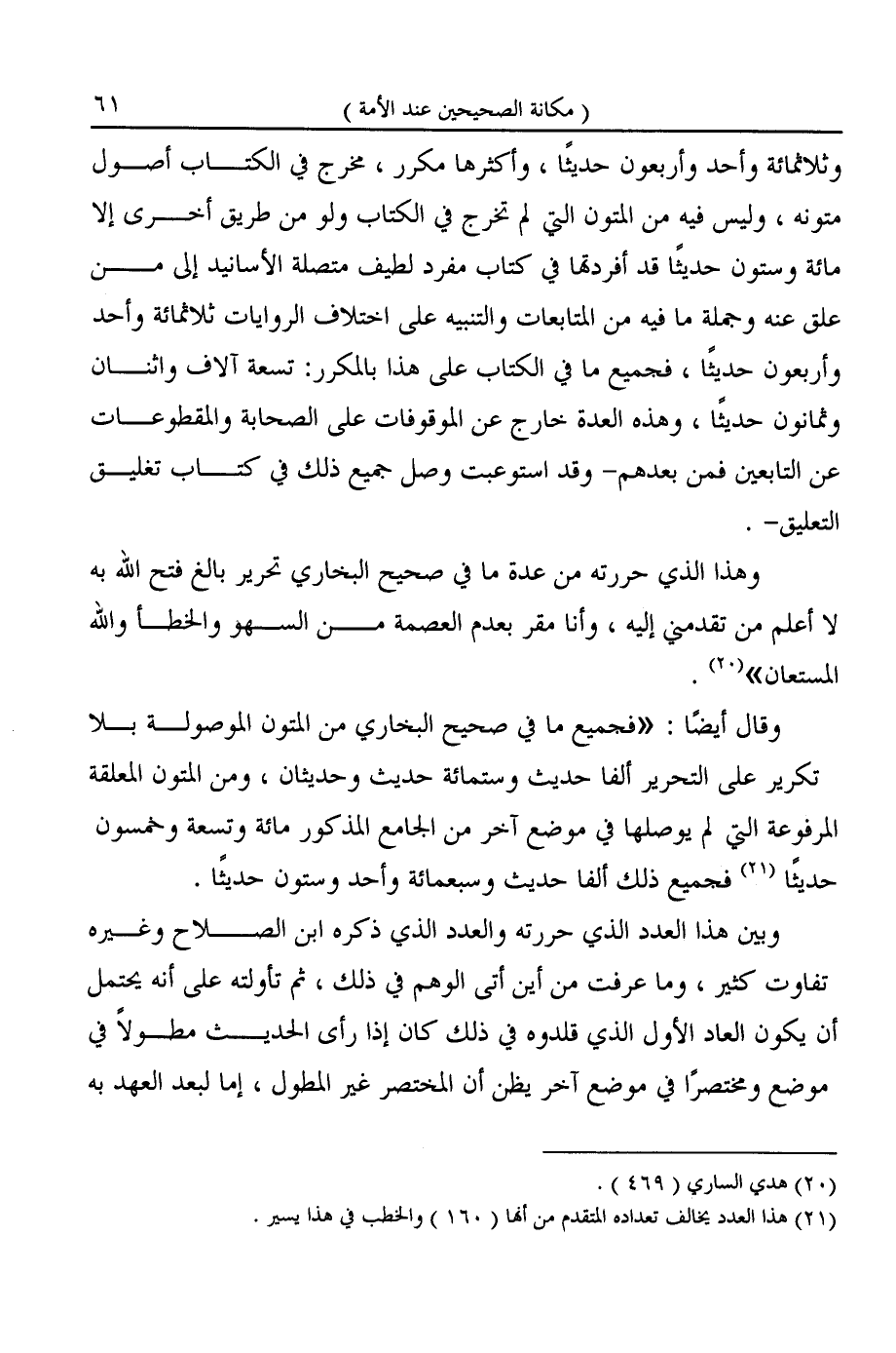 وقال أيضًا: "فجميع ما في صحيح البخاري من المتون الموصولة بلا تكرير على التحرير ألفا حديث وستمائة حديث وحديثان، ومن المتون المعلقة المرفوعة التى لم يوصلها في موضع آخر من الجامع المذكور مائة وتسعة وخمسون حديثًا (¬٢١) فجميع ذلك ألفا حديث وسبعمائة وأحد وستون حديثًا.