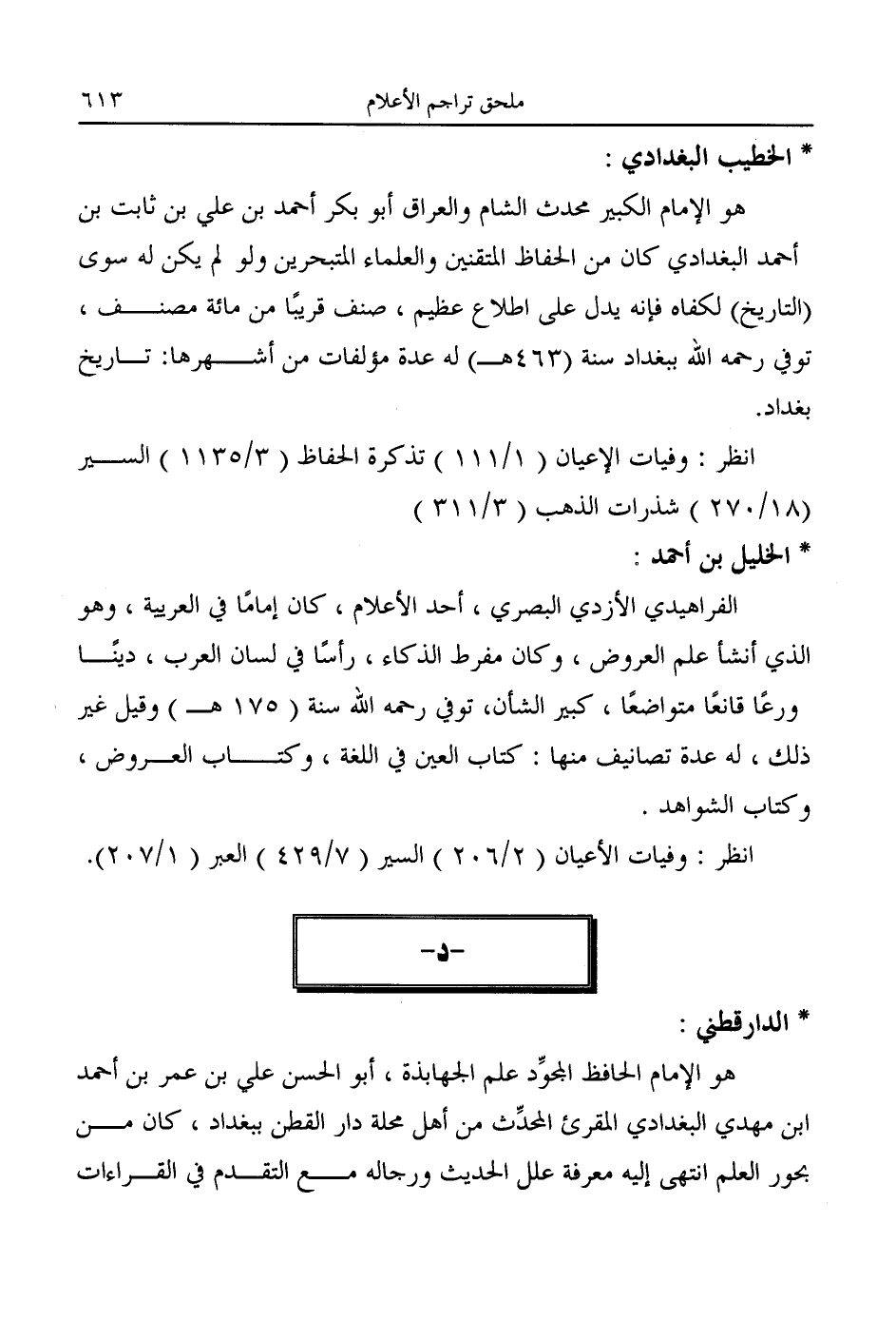الفراهيدي الأزدي البصري، أحد الأعلام، كان إمامًا في العربية، وهو الذي أنشأ علم العروض، وكان مفرط الذكاء، رأسًا في لسان العرب، دينًا ورعًا قانعًا متواضعًا، كبير الشأن، توفي رحمه الله سنة (١٧٥ هـ) وقيل غير ذلك، له عدة تصانيف منها: كتاب العين في اللغة، وكتاب العروض، وكتاب الشواهد.