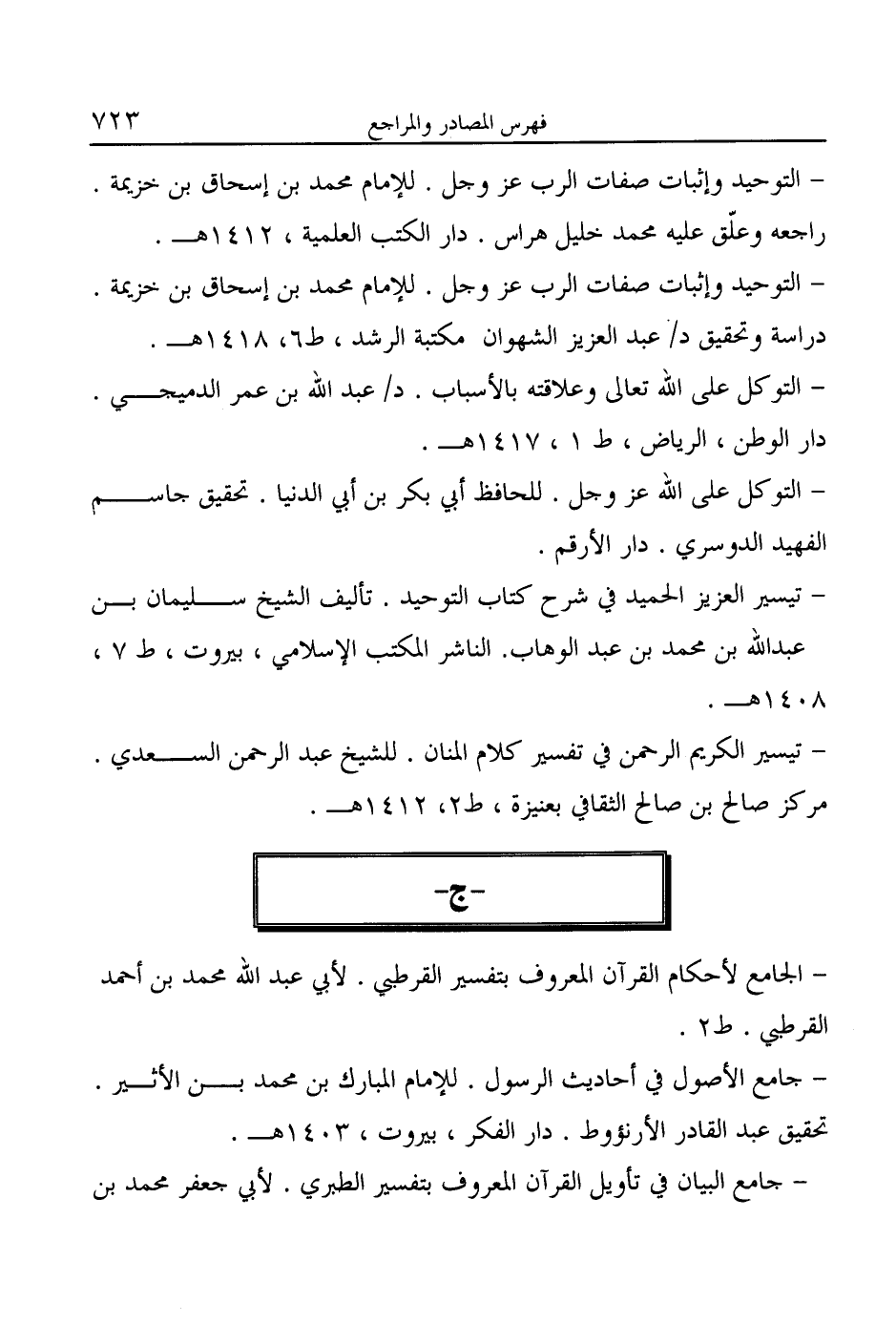 - تيسير الكريم الرحمن في تفسير كلام المنان. للشيخ عبد الرحمن السعدي. مركز صالح بن صالح الثقافي بعنيزة، ط ٢، ١٤١٢ هـ.