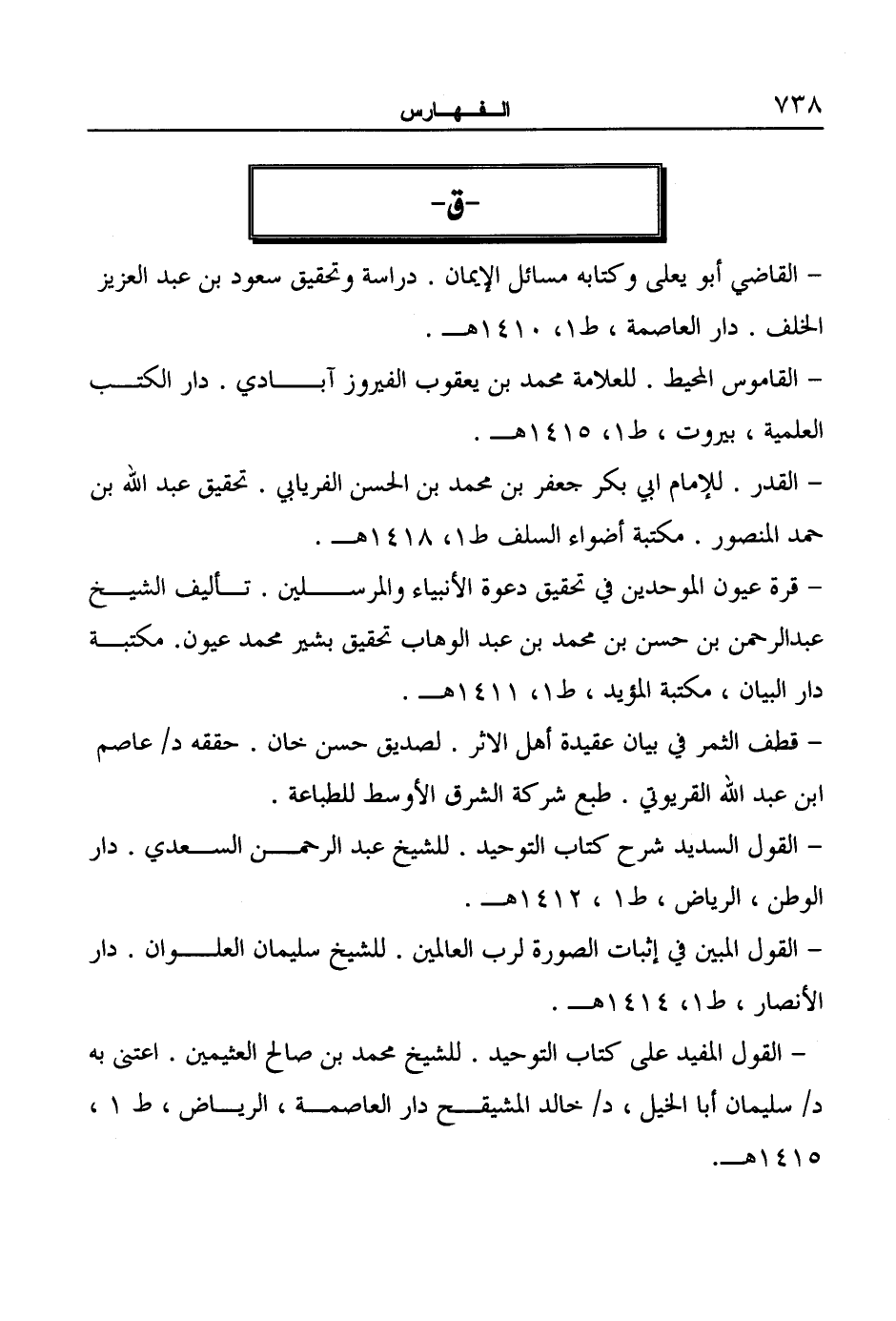 - القول المفيد على كتاب التوحيد. للشيخ محمد بن صالح العثيمين. اعتنى به د/ سليمان أبا الخيل، د/ خالد المشيقح دار العاصمة، الرياض، ط ١، ١٤١٥ هـ.