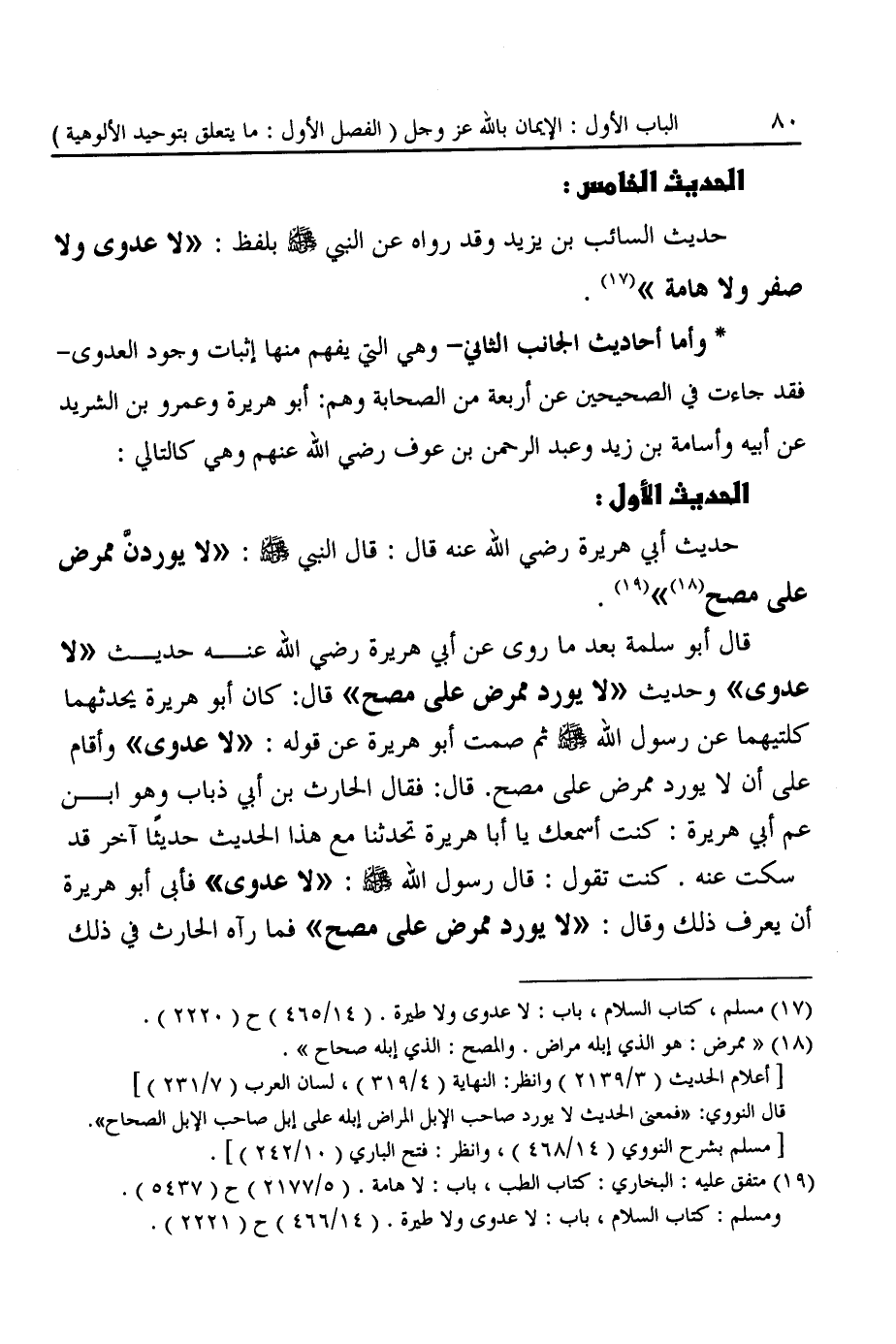 (¬١٩) متفق عليه: البخاري: كتاب الطب، باب: لا هامة. (٥/ ٢١٧٧) ح (٥٤٣٧). ومسلم: كتاب السلام، باب: لا عدوى ولا طيرة. (١٤/ ٤٦٦) ح (٢٢٢١).