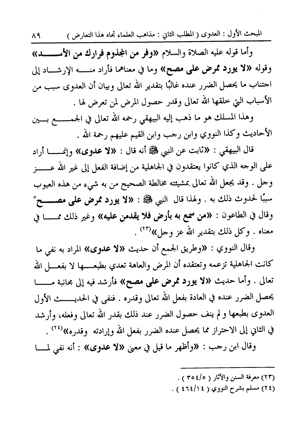 وأما قوله عليه الصلاة والسلام "وفر من المجذوم فرارك من الأسد" وقوله "لا يورد ممرض على مصح" وما في معناهما فأراد منه الإرشاد إلى اجتناب ما يحصل الضرر عنده غالبًا بتقدير الله تعالى وبيان أن العدوى سبب من الأسباب التي خلقها الله تعالى وقدر حصول المرض لمن تعرض لها.