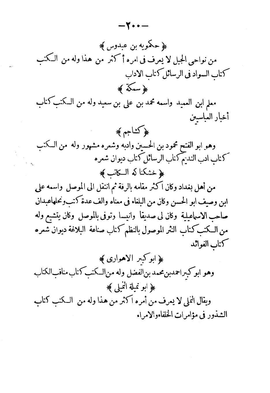 الكميت خمسون ورقة إسماعيل بن جدر الحريري مقل محمد بن كناسة الأسدي خمسون ورقة عبد القدوس وعبد الخالق ابنا عبد الواحد بن النعمان بن بشير مقلان عمرو بن جزى السكري مقل طالب وطالوت ابنا الأزهر مقلان أبو الصلع السندي ثلاثون ورقة المنجم الراسبي ثلاثون ورقة برية المصري مقل معقل بن طوق مقل عباد بن الممزق خمسون ورقة إسماعيل القراطيسي تسعون ورقة أبو يعقوب الحريمي مائتا ورقة علي بن جبلة العكوك مائة وخمسون ورقة محمد بن خادم الباهلي سبعون ورقة محمد بن بشير خمسون ورقة أحمد بن يوسف خمسون ورقة القاسم بن يوسف خمسون ورقة عوف بن محلم ثلاثون ورقة الغساني أبو محمد مقل الحسن بن طلحة القرشي مقل علي بن أبي كثير خمسون ورقة العنسق الضبي خمسون ورقة محمد وإسحاق ابنا إبراهيم الفزاري مقلان ورقة الأسدي مقل أبو دلف العجلي مائة ورقة إسحاق بن إبراهيم خمسون ورقة معقل بن عيسى أخو أبي دلف مقل المأمون عشرون ورقة محمد بن علي الضبي ثلاثون ورقة محمد بن أبي حمزة العقيلي مقل أبو صعصعة الضرير الكوفي مقل أبو بكر العروضي خمسون ورقة العلاء بن عاصم الغساني مقل الحسين بن الضحاك الباهلي مقل أبو العميثل مائة ورقة أحمد بن هشام خمسون ورقة علي بن هشام خمسون ورقة أبو حفص الشطرنجي خمسون ورقة أبو النفيعي عشر ورقات جعفر بن عفان الطائي من شعراء الشيعة وشعره مائتا ورقة أحمد بن الحجاج مقل القاسم بن سيار الكاتب خمسون ورقة أبو دفافة أحمد بن منصور مقل محمد بن أبي بدر السلمي خمسون ورقة أبو زياد الكلابي ثلاثون ورقة محمد بن يزيد بن مسلمة الحصني مائة ورقة إسحاق بن الصباح السبيعي مقل أبو راسب البجلي خمسون ورقة أبو موسى المكفوف خمسون ورقة الأخفش البصري مقل الحرمازي خمسون ورقة أبو همام روح بن عبد الأعلى خمسون ورقة عطاء بن أحمد المديني مقل محمد بن علي الجواليقي خمسون ورقة العداء الحنفي المصري خمسون ورقة سعيد بن صمصم الكلابي خمسون ورقة أبو عدنان السلمي ثلاثون ورقة إسماعيل بن أبي محمد اليزيدي خمسون ورقة منصور الهندي غلام حفصويه مقل أبو عمران السلمي خمسون ورقة أبو شبل العقيلي مقل الهيثم بن مطهر الغافا مقل الفضل بن إسماعيل بن صالح الهاشمي مائة ورقة.