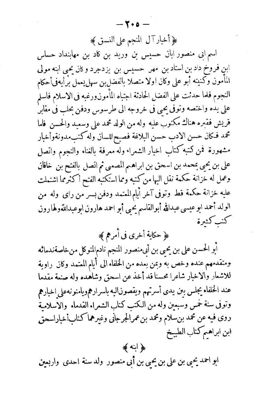 محمد بن احمد مائتا ورقة أبو جعفر نصر بن محمد بن جهان الموصلي الفقيه مائتا ورقة أبو الحسن محمد بن السلامي نحو خمسمائة ورقة بن جلباب أبو جعفر الضرير واسمه مائتا ورقة الإسكافي واسمه نحو مائتي ورقة محمد بن الصنوبري أبو بكر من أهل أنطاكية عمل شعره الصولي على الحروف مائتا ورقة كشاجم ولد السندي بن شاهك مائة ورقة وله كتاب أدب التديم المغنم المصري من شعراء سيف الدولة واسمه أبو الحسن محمد بن سلمى الشعباني لم يذكر ماله وله قصيدة الدلالة دون مائتي ورقة البديحي واسمه أحمد بن محمد من أهل النطاكية مائة ورقة أبو المعتصم الأنطاكي واسمه ثلاثمائة ورقة بن أبي زرعة الدمشقي قتل الثلثمائة مائة وخمسون ورقة الببغا أبو الفرج عبد الواحد بن نصر الشامي مطبوع الشعر ولقي سيف الدولة وله رسائل وشعره ثلاثمائة ورقة الخبزارزي واسمه نصر بن أحمد بن مأمون من شعراء البصرة رقيق الألفاظ غير بصير بصناعة الشعر وقد عمل شعره على الحروف ونحل إلى الصولي ثلاثمائة ورقة أبو الطيب أحمد بن الحسين المتنبي وشهرته تغني عن الإطناب في ذكره كوفي ولقي سيف الدولة وشعره فيه مشهور ثلاثمائة ورقة وقد عرب شعره وتكلم عليه جماعة منهم أبو الفتح بن جني اللغوي أبو العباس النامي وإلى الوقت الذي توفي فيه وشعره نحو المائة وخمسين ورقة وعمله أبو أحمد الخلال الخالع أبو عبد الله محمد بن الحسين لقي سيف الدولة وله من الكتب أبو منصور بن أبي براك هذا أستاذ السري بن أحمد الكندي شاعر مجود ويقال ان السرى سرق شعره وانتحله والذي رأيت منه نحو مائتي ورقة أبو نصر بن نباتة التميمي من شعراء سيف الدولة وتوفي بعد الأربعمائة وكان مخفيا نحو أربعمائة بن الزمكون أبو موصلي حبيب الشعر هجاء وكان غواصا على المعاني وشعره نحو الثلثمائة ورقة الخباز البلدي واسمه محمد بن ويكنى أبا بكر وقد عمل الخالديان شعره بالموصل نحو ثلاثمائة ورقة وكان مجودا الشيظمي واسمه وكان يحول ثم انقطع إلى سيف الدولة وقد عمل شعره قبل موته ومقداره نحو خمسمائة ورقة.