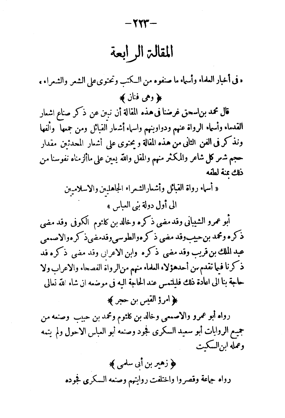 الفن الثالث من المقالة الخامسة: في أخبار العلماء وأسماء ما صنفوه من الكتب. ويحتوي على أخبار متكلمي المجبرة وبابية الحشوية وأسماء كتبهم.