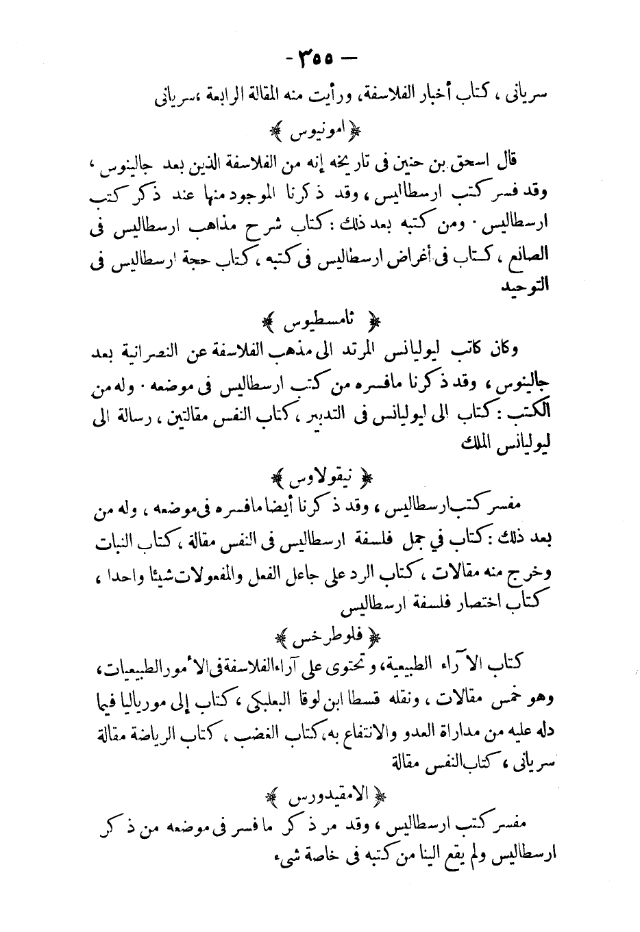 سورنوس: الحكيم لا يعرف موضعه وله من الكتب كتاب الحقن نقل اسطاث وإصلاح حنين.