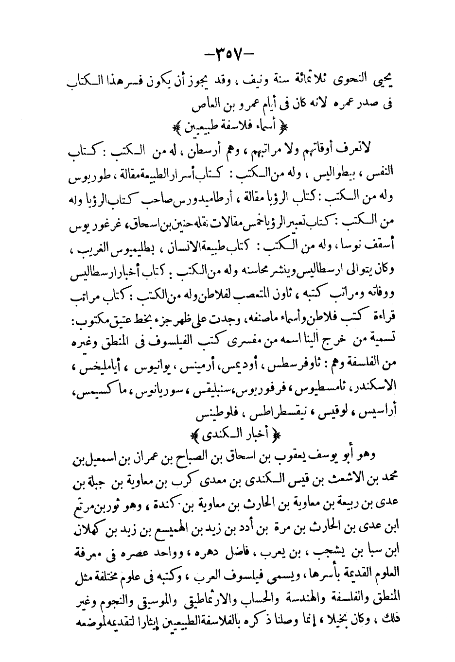 وتقدمه في صناعة الطب ولكن بعض الاخوان سأل أن يقدم حنين عليه وكلا الرجلين فاضل وقد ترجم قسطا قطعة من الكتب القديمة وكان بارعا في علوم كثيرة منها الطب والفلسفة والهندسة والاعداد والموسيقى لا مطعن عليه فصيحيحا باللغة ة اليونانية جيد العبارة بالعربية وتوفي بأرمينية عند بعض ملوكها ومن ثم أجاب أبا عيسى بن المنجم عن رسالته في نبوة محمد عليه السلام وثم عمل الفردوس في التاريخ وله من الكتب سوى ما نقل وفسر وشرح كتاب الدم كتاب البلغم كتاب الصفراء كتاب السوداء كتاب المرايا المحرقة كتاب السهر كتاب في الأوزان والمكاييل كتاب السياسة ثلاث مقالات كتاب علة موت الفجأة كتاب الأعداء كتاب معرفة الخدر وعلاجه كتاب أيام البحران كتاب علل الشعر كتاب الفصل بين النفس والروح كتاب الباه كتاب العلة في اسوداد الحبش وتغيره من الرش كتاب في المروحة وأسباب الريح كتاب في مترك فيه الاخلاط الأربعة كتاب الفرسطون كتاب في الاستدلال بالنظر إلى أصناف البول كتاب المدخل إلى المنطق كتاب العمل بالكرة النجومية كتاب نوادر اليونانيين نقله كتاب شرح مذاهب اليونانيين كتاب المدخل إلى علم الهندسة كتاب رسالته في الخضاب كتاب رسالته في قوانين الأغذية كتاب شكوك كتاب إقليدس كتاب الفصد ثمانية عشر بابا كتاب المدخل إلى علم النجوم كتاب الحمام كتاب الفردوس في التاريخ كتاب رسالته في استخراج مسائل عدديات من المقالة الثالثة من إقليدس كتاب تفسيره لثلاث مقالات ونصف من كتاب ديوفنطس في المسائل العددية.