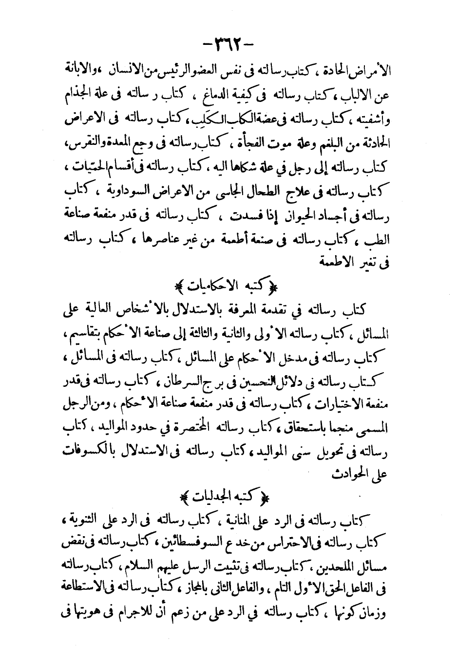 فرفوريوس في شرح مذاهب أرسطاليس في العلم الإلهي كتاب في الخلاء والملاء هما الزمان والمك كتاب الصغير في العلم الإلهي كتاب الهيولي المطلقة والجزئية كتاب إلى أبي القاسم البلخي في الزيادة على جوابه وعلى جواب هذا الجواب كتاب الرد على أبي القاسم البلخي في نقضه المقالة الثانية في العلم الإلهي كتاب الجدري والحصبة كتاب الحصى في الكلى والمثانة كتاب إلى من لا يحضره طبيب كتاب الأدوية الموجودة بكل مكان كتاب الطب الملوكي كتاب التقسيم والتشجير كتاب اختصار كتاب النبض الكبير لجالينوس كتاب الرد على الجاحظ في نقص الطب كتاب مناقضة الجاحظ في كتابه في فضيلة الكلام كتاب الفالج كتاب اللقوة كتاب هيئة الكبد كتاب النقرس وعرق المديني كتاب هيئة العين كتاب الانثيين كتاب هيئة القلب كتاب هيئة السماخ كتاب اوجاع المفاصل اثنان وعشرون فصلا كتاب اقراباذين كتاب الانتقاد والتحرير على المعتزلة كتاب الخيار المر كتاب كيفية الاغتذاء كتاب إبدال الأدوية كتاب خواص الأشياء كتاب الهيولي الكبير كتاب سبب وقوف الأرض وسط الفلك كتاب سبب تحرك الفلك على استدارة كتاب في نقض الطب الروحاني على بن اليمان كتاب في أنه ل لا يمكن ان يكون العالم لم يزل على ى مثال ما نشاهده كتاب في ان الحركة ليست مرئية بل معلومة كتاب في ان الجسم يتحرك من ذاته وان الحركة مبدأ طبيعته كتاب في الشكوك التي على برقلس كتاب تقسيم الأمراض وأسبابها وعلاجاتها على الشرح كتاب تفسير كتاب فلوطرخس في تفسير كتاب طيماوس كتاب نقضه على سهيل البلخي فيما ناقضه به من اللذة كتاب في العلة التي لها يحدث الورم من الزكام في رءوس بعض الناس كتاب في التلطف في إيصال العليل إلى بعض شهواته كتاب العلة في خلق السباع والهوام كتاب على بن اليمان في نقضه على المسمعي في الهيولي كتاب نقض نقض كتاب التدبير كتاب النقض على الكيال في الاماماب اختصار كتاب حيلة البرء لجالينوس كتاب تلخيصه لكتاب العلل والاعراض كتاب تلخيصه لكتاب المواضع الألمة كتاب نقض نقض البلخي للعلم الإلهي كتاب رسالته في قطر المربع كتاب في أن جواهر لا أجسام كتاب في السيرة الفاضلة كتاب في وجوب الأدعية كتاب في الإشفاق على أهل التحصيل من المتكلمين والمتفلسفين كتاب الحاصل في العلم الإلهي كتاب رسالته في العلم الإلهي لطيفة كتاب دفع مضار الأغذية كتاب على سهيل البلخي في تثبيت المعاد كتاب في علة جذب حجر المغناطيس كتاب في ان النفس ليست بجسم كتاب النفس كبير كتاب في النفس صغير كتاب ميزان العقل كتاب في السكر مقالتان كتاب