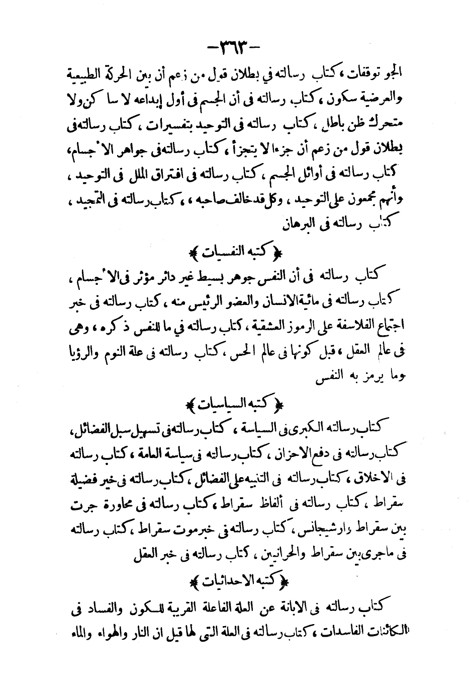 رسالة في التعري والتدثر رسالته في التركيب رسالته في الجبر وكيف يساق اليه وعلامة الحق فيه رسالته فيما لا يلصق مما يقطع من البدن وان صغر وما يلصق من الجراحات وان كبر رسالته في تبريد الماء على الثلج وتبريد الماء يقع الثلج فيه رسالته في المنطق رسالته في تعطيش السمك والعلة فيه رسالته في كيفية النحور رسالته في العلة التي لها لا يوجد شراب يفعل فعل الشراب الصحيح بالبدن رسالته في غروب الشمس والكواكب وان ذلك ليس من أجل حركة الأرض بل حركة الفلك رسالته في انه لا يتصور لمن لا رياضة له بالبرهان ان الأرض كرية وان الناس حولها رسالته في فسخ ظن من توهم ان الكواكب ليست في نهاية الاستدارة رسالته في البحث عن الأرض الطبيعية هي الطين أم الحجر رسالته في تثبيت الاستحالة رسالته في العطش وازدياد الحرارة لذلك رسالته في العادة وانها تحول طبيعة رسالته في العلة التي من أجلها تضيق النواظر في النور وتتسع في الظلمة رسالته في العلة التي لها زعم بعض الجهال أن الثلج يعطش رسالته في أطعمة المرضى كتاب ما استدركه من الفصل في الكلام في القائلين بحدوث الأجسام على القائلين بقدمها كتاب في أن العلة اليسيرة بعضها أعسر تعرفا وعلاجا من الغليظة رسالته في العلل المشكلة كتاب في العلة التي يذم لها بعض الناس وعوامهم الطبيب وان كان حاذقا رسالته في أن الطبيب الحاذق ليس هو من قدر على ابراء جميع العلل وان ذلك ليس في الوسع رسالته في العلل القاتلة لعظمها والقاتلة لظهورها بغتة رسالته في أن الصانع المستغرق بصناعة معدوم في جل الصناعات إلا في الطب خاصة