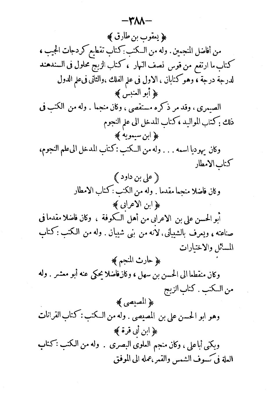 للمسلمين ثلاث في كل يوم الأولى في الساعة الثانية من النهار والثانية في الساعة التاسعة من النهار والثالثة في الساعة الثالثة من الليل ولا صلاة عندهم الا على طهور والمفترض عليهم من الصيام ثلاثون يوما أولها لثمان مضين من اجتماع أذار وتسعة أخر أولها لتسع بقين من اجتماع كانون الأول وسبعة أيام أخر أولها لثمان مضين من شباط وهي أعظمها ولهم تنفل من صيامهم وهو ستة عشر وسبعة وعشرون يوما ولهم قربان يتقربون به وانما يذبحون للكواكب ويقول بعضهم انه إذا قرب باسم الباري كانت دلالة القربان ردية لأنه عندهم تعدى إلى أمر عظيم وترك ما هو دونه لما جعله متوسطا في التدبير والذي يذبح للقربان الذكور من البقر والضأن والمعز وسائر ذي الأربع غير الجزور مما ليس له أسنان في اللحيين جميعا ومن الطير غير الحمام مما لا مخلب له والذبيحة عندهم مع قطع الاوداج والحلقوم والتذكية متصلة مع الذبيحة لا انفصال بينهما وأكثر ذبائحهم الديوك ولا يؤكل القربان ويحرق ولا يدخل الهياكل ذلك اليوم وللقربان أربعة أوقات في الشهر الاجتماع والاستقبال وسبعة عشر وثمانية وعشرين وأعيادهم عيد يسمى عيد فطر السبعة وفطر الشهر وقيل فطر الثلاثين بيومين وبعد هذا الفطر بخمسة أيام وبعد هذا الفطر بثمانية عشر يوما وهو يوم ستة وعشرين من الشهر وعيد الحبل وهو في خمسة وعشرين من تشرين الأول وعيد الميلاد وهو في ثلاثة وعشرين من كانون وعيد في تسعة وعشرين من تموز وعليهم الغسل من الجنابة وتغيير الثياب ومن مس الطامث وتغيير الثياب ويعتزل الطامث البتة وقد يغتسل من الجنابة ومس الطامث بالغسل والنطرون ولا ذبيحة عندهم الا لماله رئة ودم وقد نهوا عن أكل الجزور وما لم يذك وكل ما له أسنان في اللحيين جميعا كالخنزير والكلب والحمار ومن الطير غير الحمام وما له مخلب ومن النبات غير الباقلى والثوم ويتعدى بعضهم اللوبيا والقنبيط والكرنب والعدس ويفرطون في كراهة الجمل حتى يقولون أن من مشى تحت خطام بعير لم يقض حاجته ذلك ويجتنبون كل من به مرض الوضح والجذام وسائر الأمراض التي تعدي ويتركون الاختتان ولا يحدثون على فعل الطبيعة حدثا ويتزوجون بشهود لا من القريب القرابة وفريضة الذكر والأنثى سواء ولا طلاق إلا بحجة بينة عن فاحشة ظاهرة ولا يراجع المطلقة ولا يجمع بين امرأتين ولا يطأهن إلا لطلب الولد.